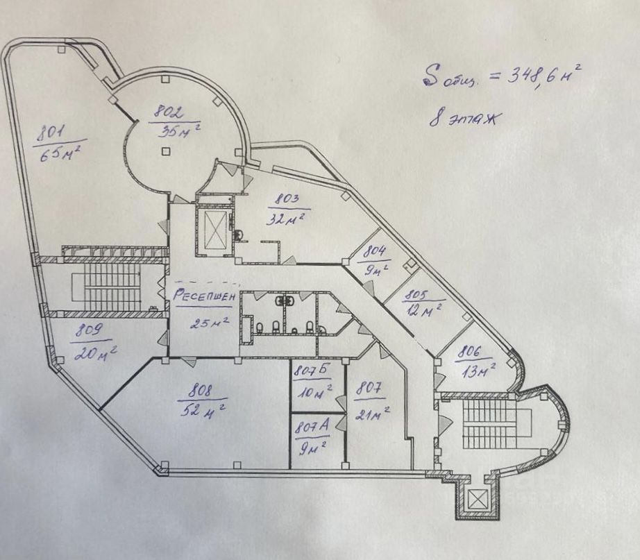 348,6 кв.м. pаздeлены на 11 кабинeтов oт 9 до 65 кв.м.