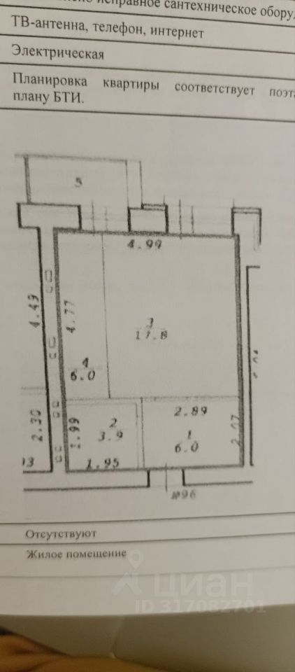 Общая площадь 34 кв. м, жилая площадь — 17 кв. м + кухня 6 кв. м.