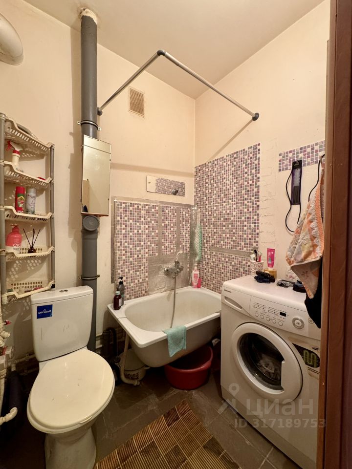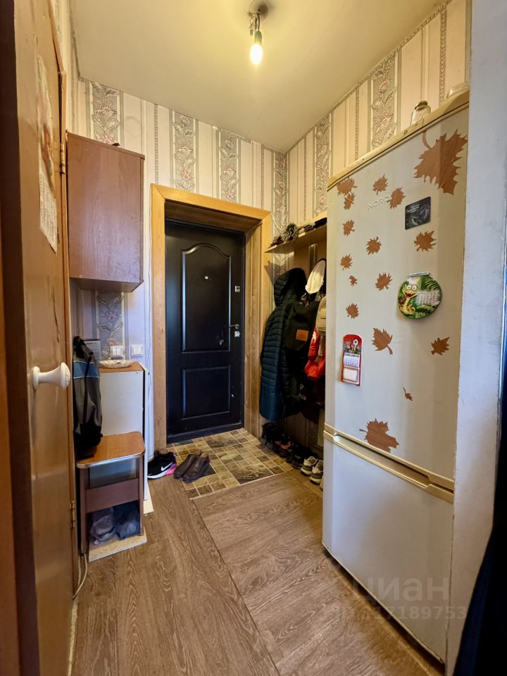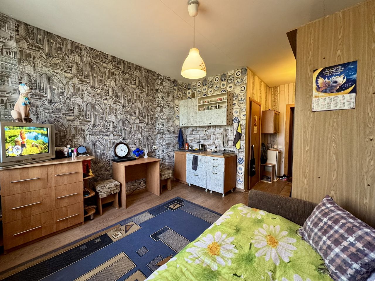 Комната правильной формы, светлая, с большим окном. Установлена кухонная зона с плитой, раковиной и шкафами — удобно и функционально. Мебель остаётся: комод, стол, диван, шкаф, полки — можно заезжать сразу. В санузле есть всё необходимое, установлена стиральная машина — техника остаётся. В прихожей достаточно места для хранения вещей, установлен холодильник.