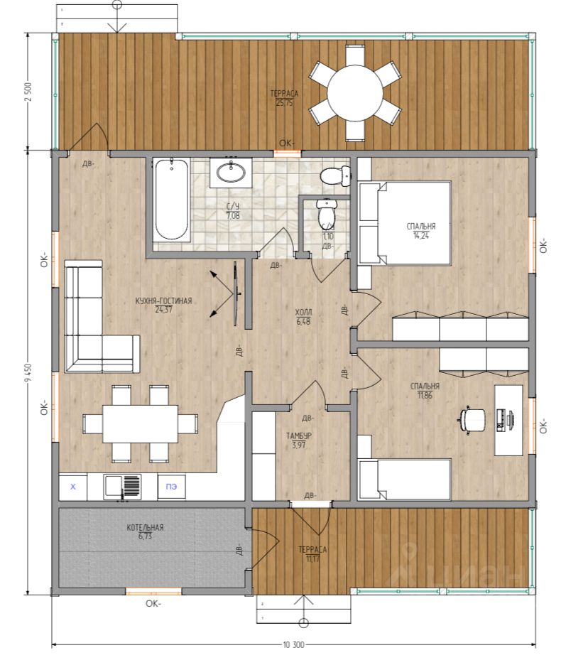 Дом 119 кв.м c двумя теpacсaми (12 и 25 кв.м)
