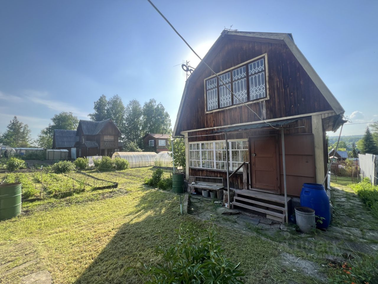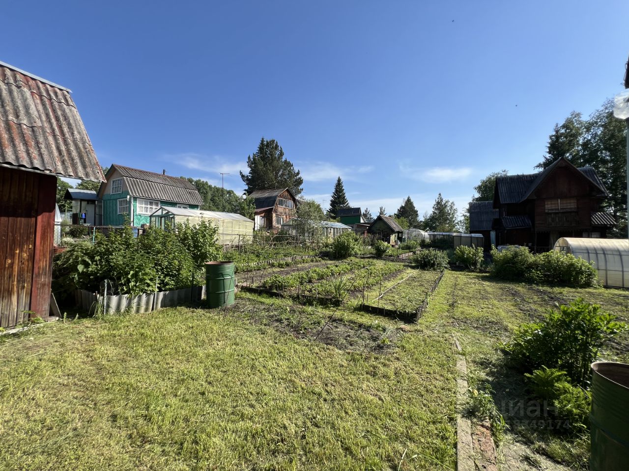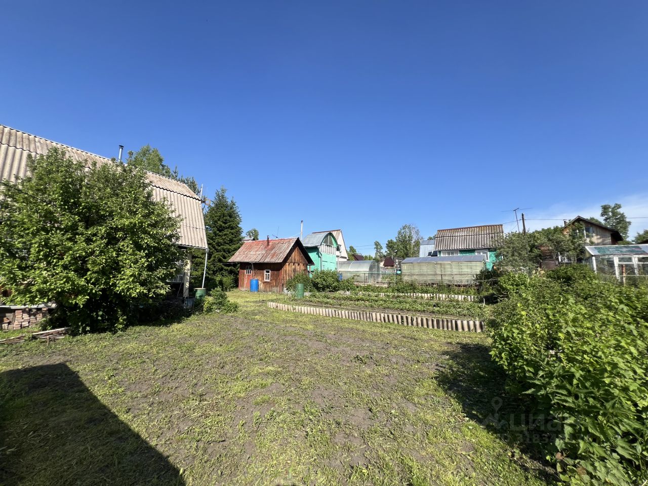 Есть теплица, железный гараж, кустарники и грядки виктории.