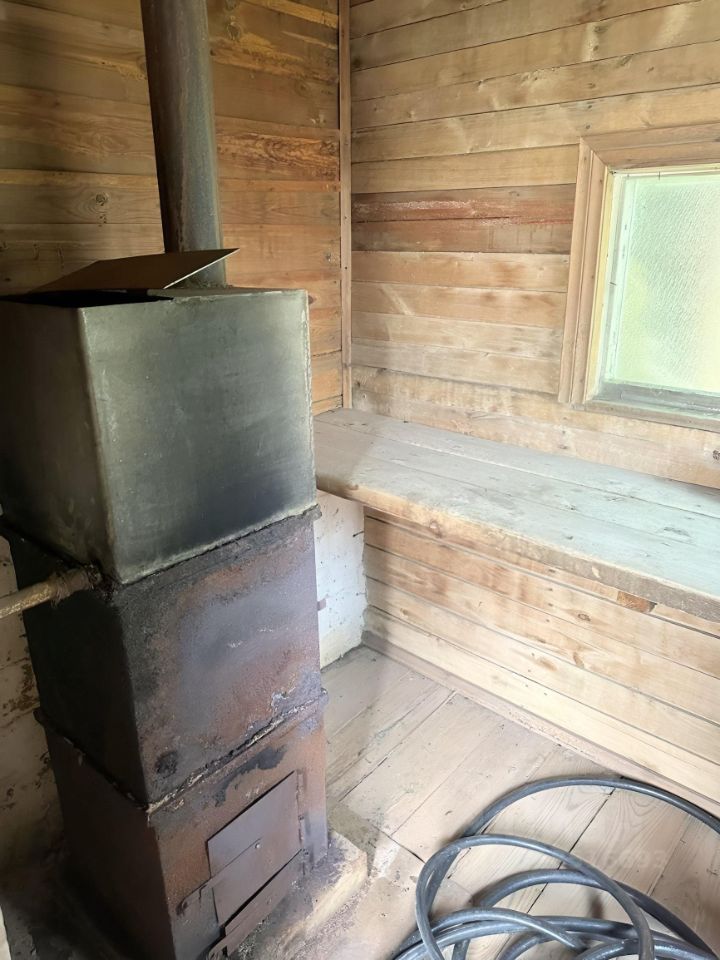 Планировка участка прямоугольная с небольшим уклоном. На территории расположена баня: полы обшиты досками, бак сварен недавно, топится отлично.