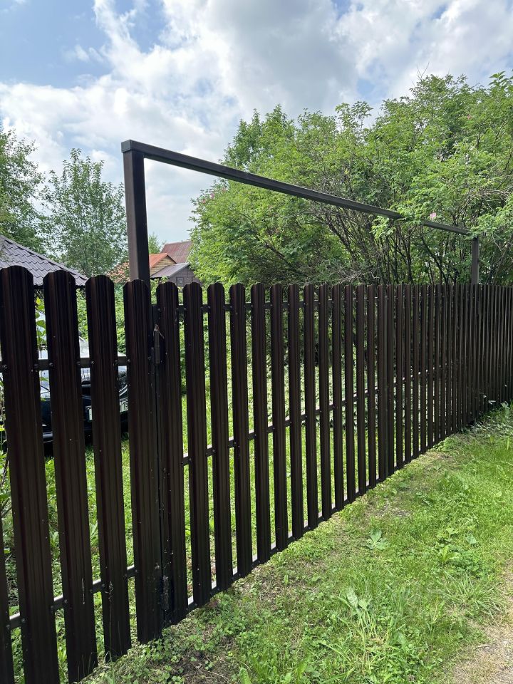 Участок полностью огорожен забором: лицевая часть выполнена из штакетника, есть калитка и ворота, установленные два года назад.