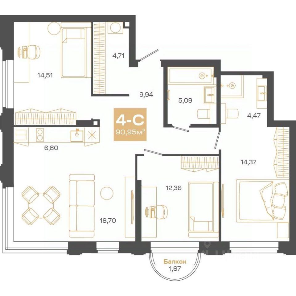 Общая площадь90,57 м2