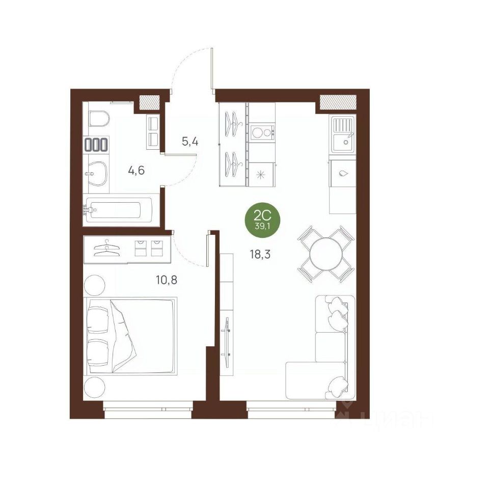 Общая площадь39,1 м2