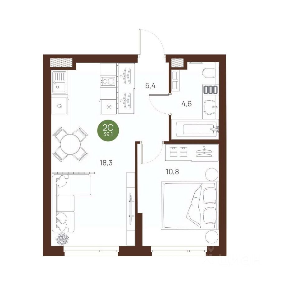 Общая площадь39,1 м2