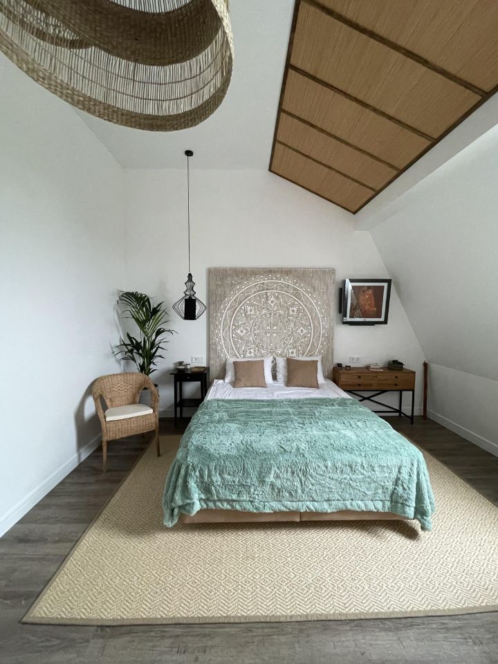 Третий этаж - холл свободного назначения (сейчас у нас там висит гамак для аэро-йоги, по желанию - оставим новым хозяевам), ванная комната с ванной, раковиной из камня с Бали, туалетом с гигиеническим душем, большая спальня с гардеробной.