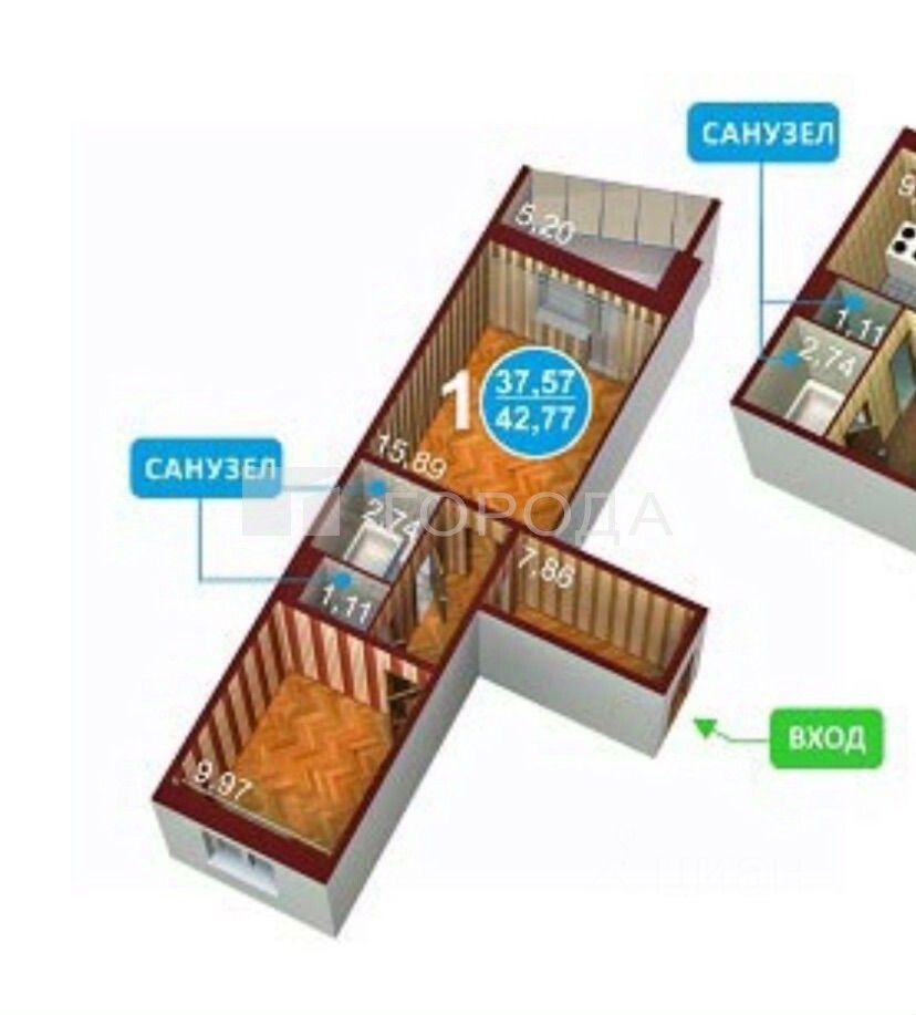 Общая площадь — 37,7 кв. м. Санузел раздельный. В ванной- душевая кабина.
