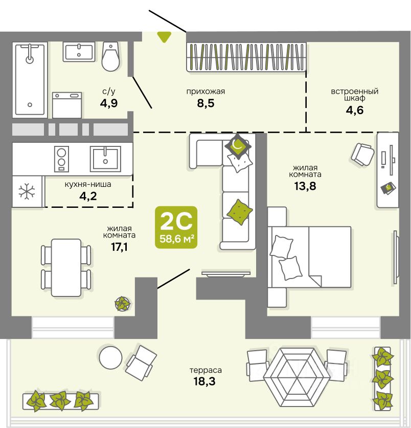 Общая площадь58,6 м2