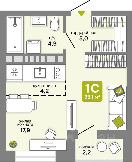 Общая площадь33,1 м2
