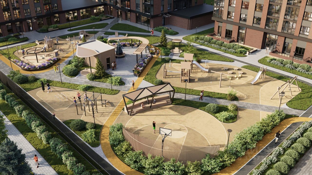 Закрытый двор без машин Охрана и видеонаблюдение Озеленение придомовой территории Детские площадки для разных возрастов Большая спортивная площадка Площадь благоустройства 5000 кв м