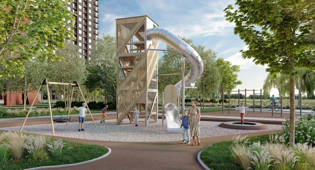Комплекс будет состоять из нескольких домов от 11 до 25 этажей расположенных на берегу реки, с большим общим дворовым пространством и отдельно стоящей подземно-наземной парковкой.