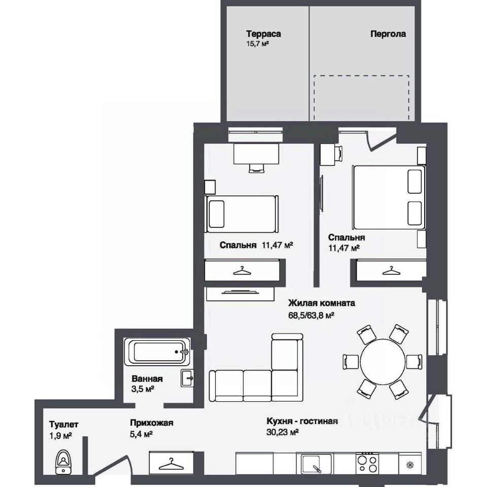 В комплексе представлены студии и 13-комнатные квартиры площадью от 30,2 до 91,9 м². Планировки продуманы для удобной жизни — просторные кухни-гостиные, террасы и панорамные окна наполняют квартиры светом.