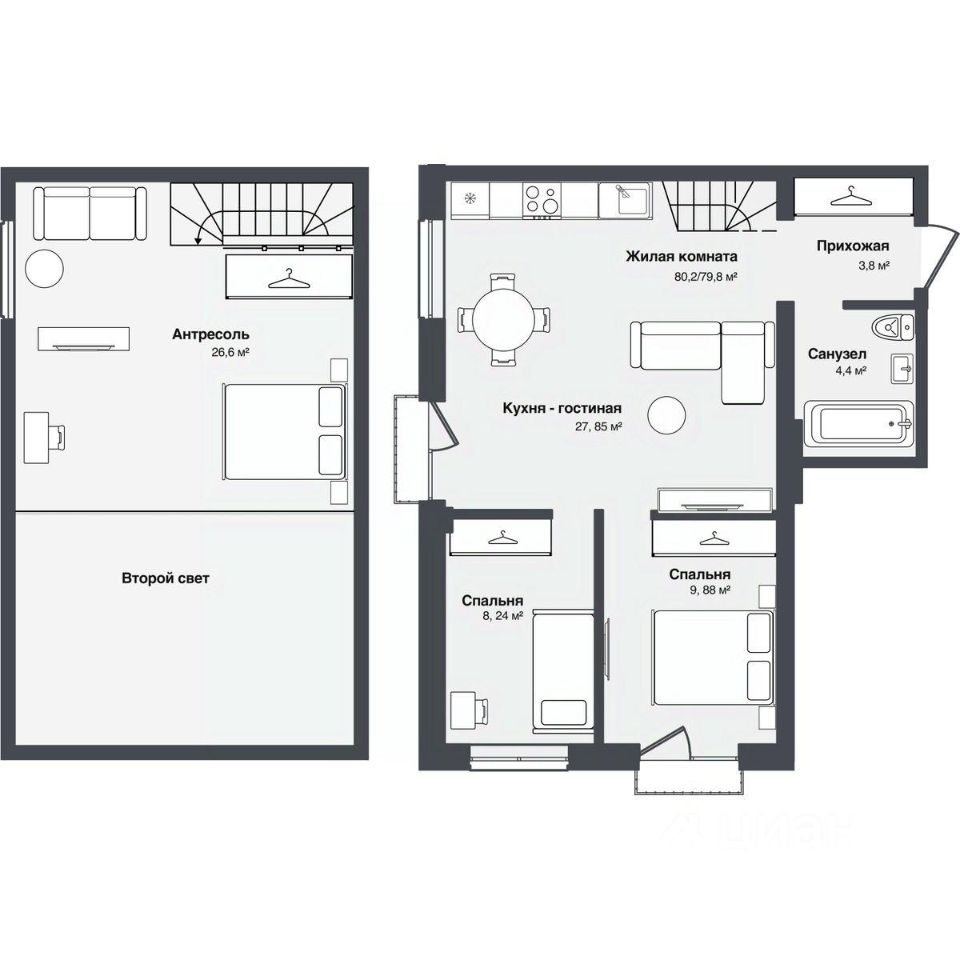 В комплексе представлены студии и 13-комнатные квартиры площадью от 30,2 до 91,9 м². Планировки продуманы для удобной жизни — просторные кухни-гостиные, террасы и панорамные окна наполняют квартиры светом.