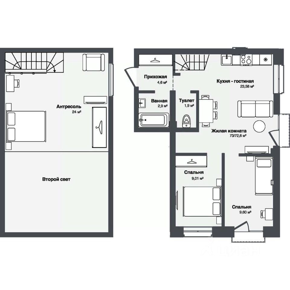 В комплексе представлены студии и 13-комнатные квартиры площадью от 30,2 до 91,9 м². Планировки продуманы для удобной жизни — просторные кухни-гостиные, террасы и панорамные окна наполняют квартиры светом.