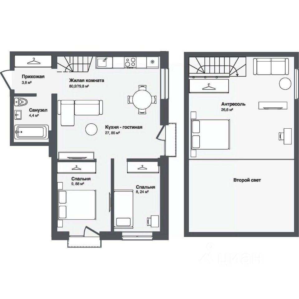 В комплексе представлены студии и 13-комнатные квартиры площадью от 30,2 до 91,9 м². Планировки продуманы для удобной жизни — просторные кухни-гостиные, террасы и панорамные окна наполняют квартиры светом.