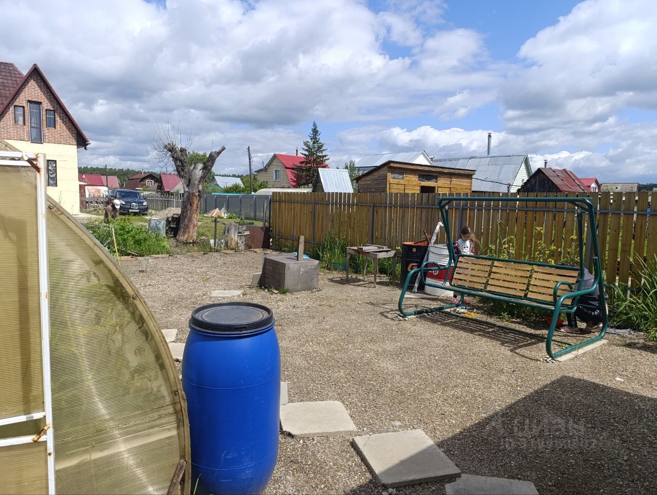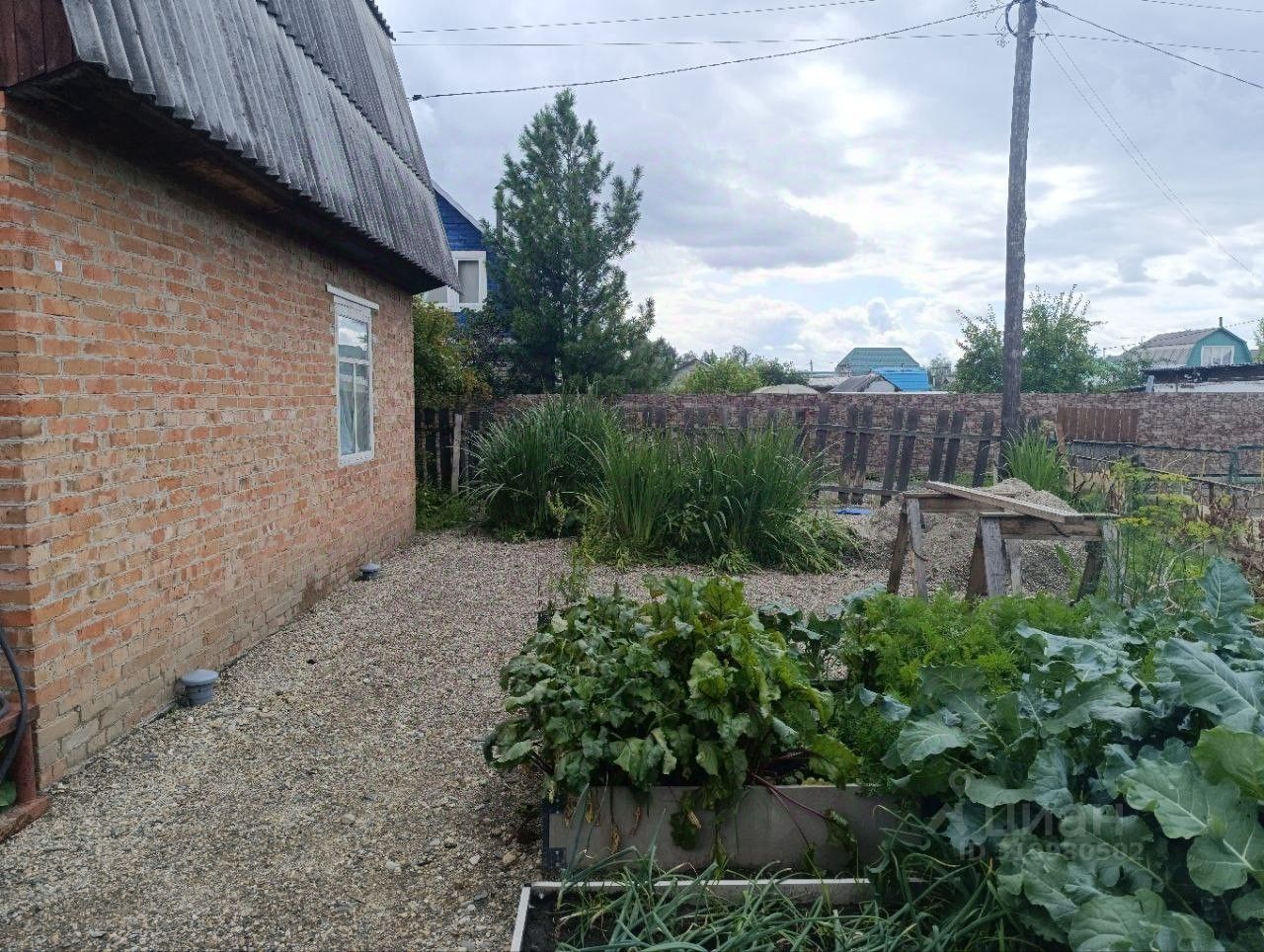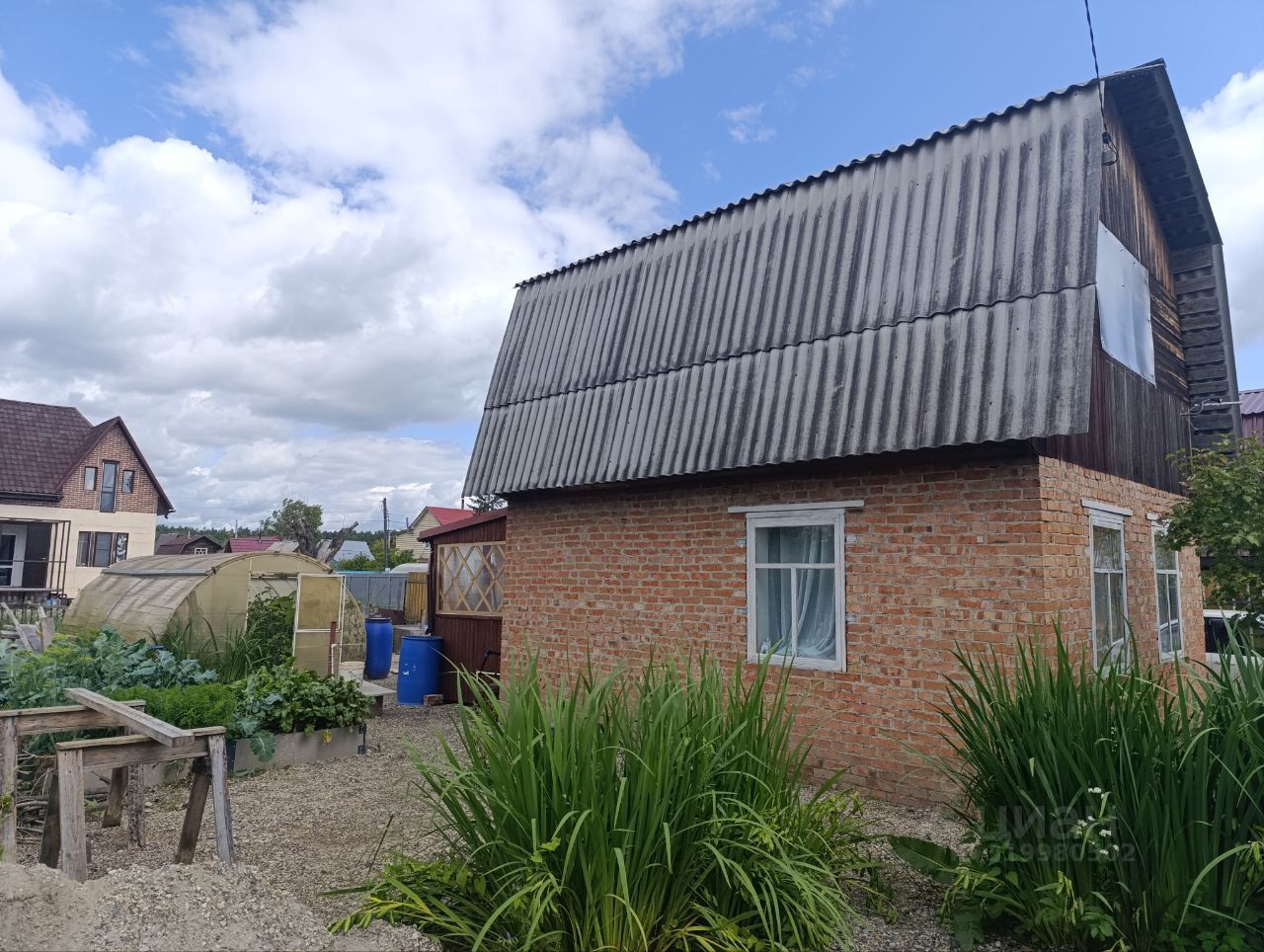 Участок 4 сотки, отсыпан пгс, есть две высокие грядки и большая теплица. Из посадок- жимолость, смородина, яблоня. Многолетние цветы и кустарники.
