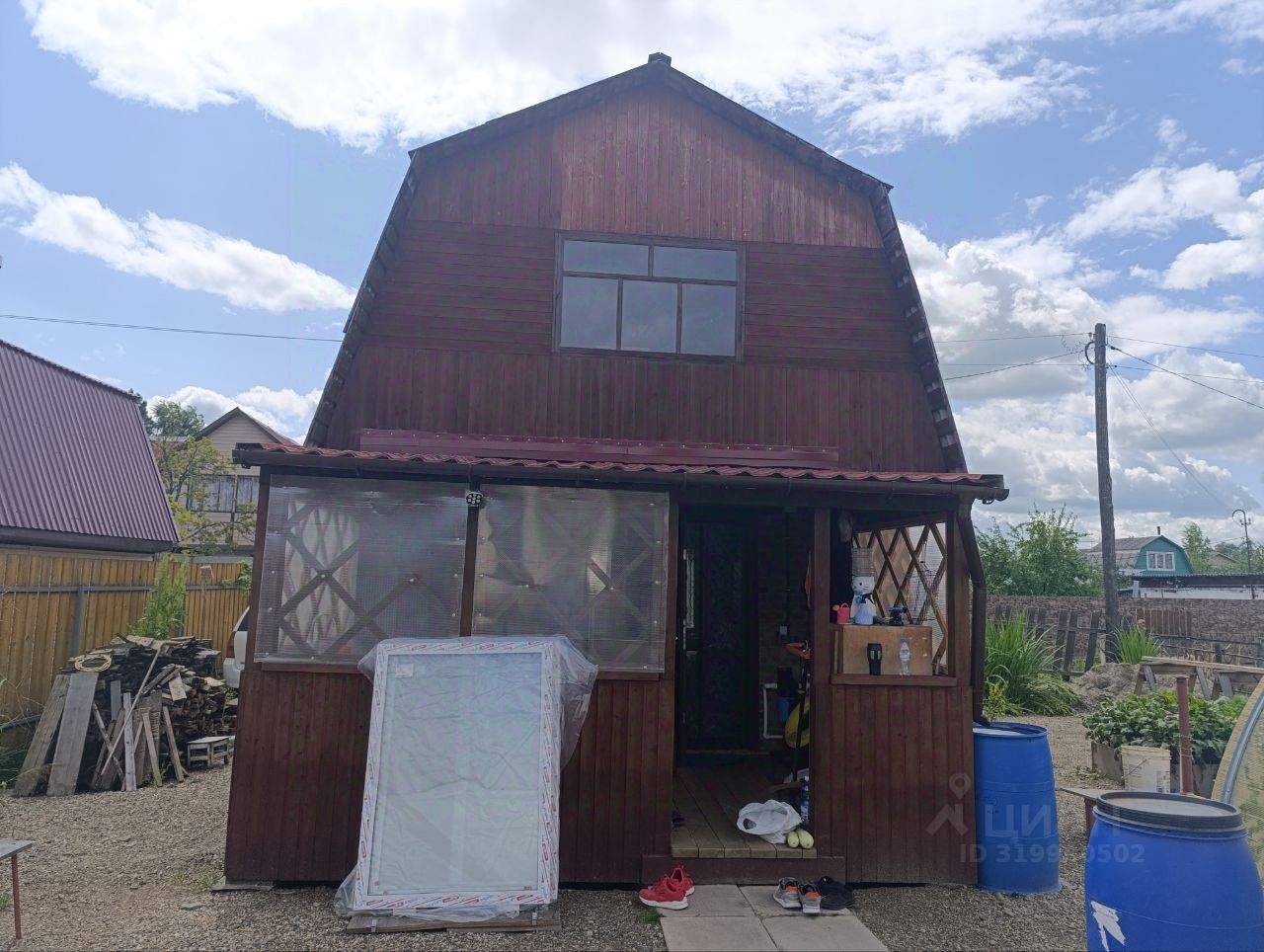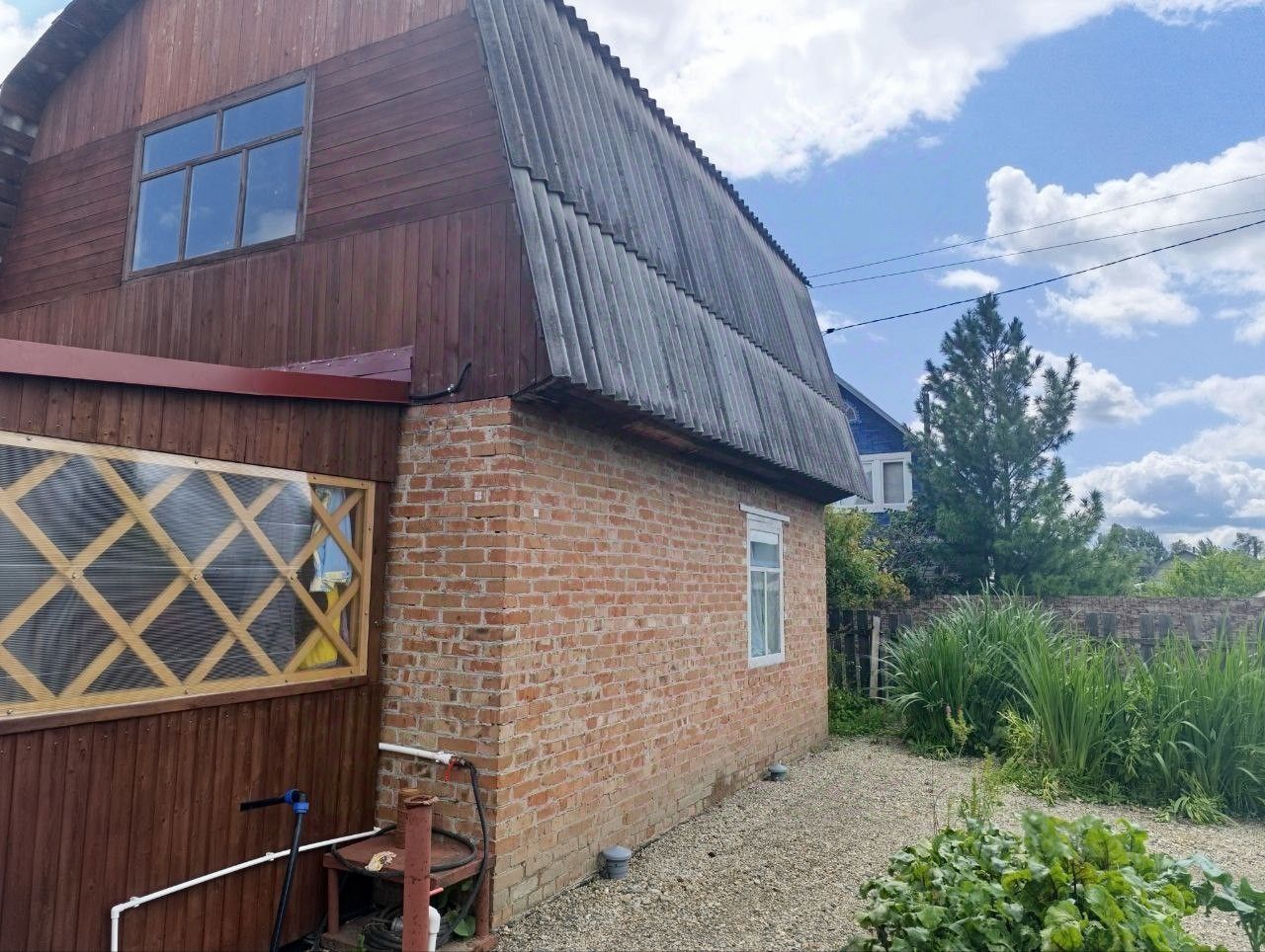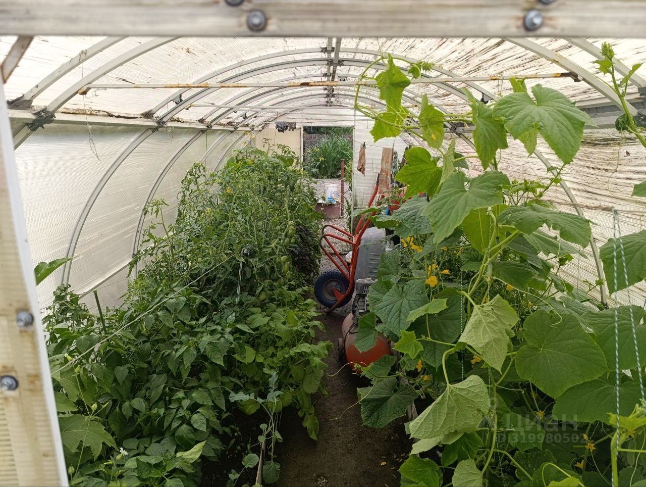 Участок 4 сотки, отсыпан пгс, есть две высокие грядки и большая теплица. Из посадок- жимолость, смородина, яблоня. Многолетние цветы и кустарники.