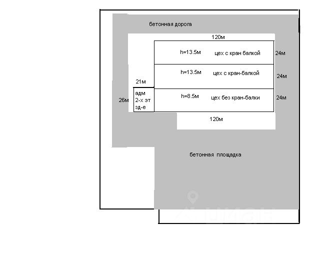 - общая площадь здания с АБК 11 290 кв.м. - площадь цехов 8 936 кв.м. по 3000 кв.м. каждый - параметры каждого цеха 120м\_24м\_13м - имеются 2 мостовых крана по 20 тонн без эл. двигателей. - площадь АБК 1250 кв.м. - Заглубленный склад (бомбоубежище) 1 104 м2, - Земельный участок 3,67 га. - категория - земли населенных пунктов, назначение - для завершения строительства производственных зданий.