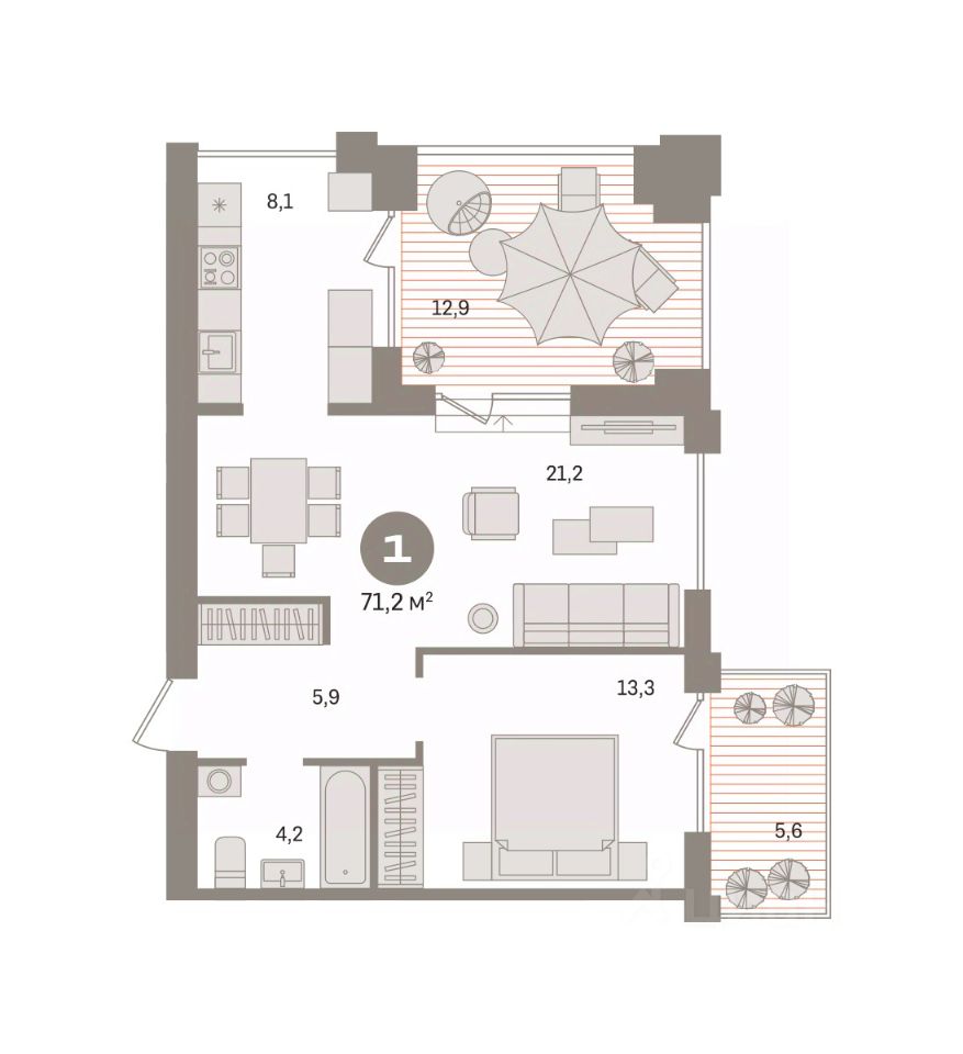 Квартира с кухней-гостиной и одной спальней в жилом районе ''Пшеница''. Особенности планировки: балкон, предчистовая отделка, терраса на крыше. квартиры в нашей базе: ПШЦ02.1-Ж1.6.2.