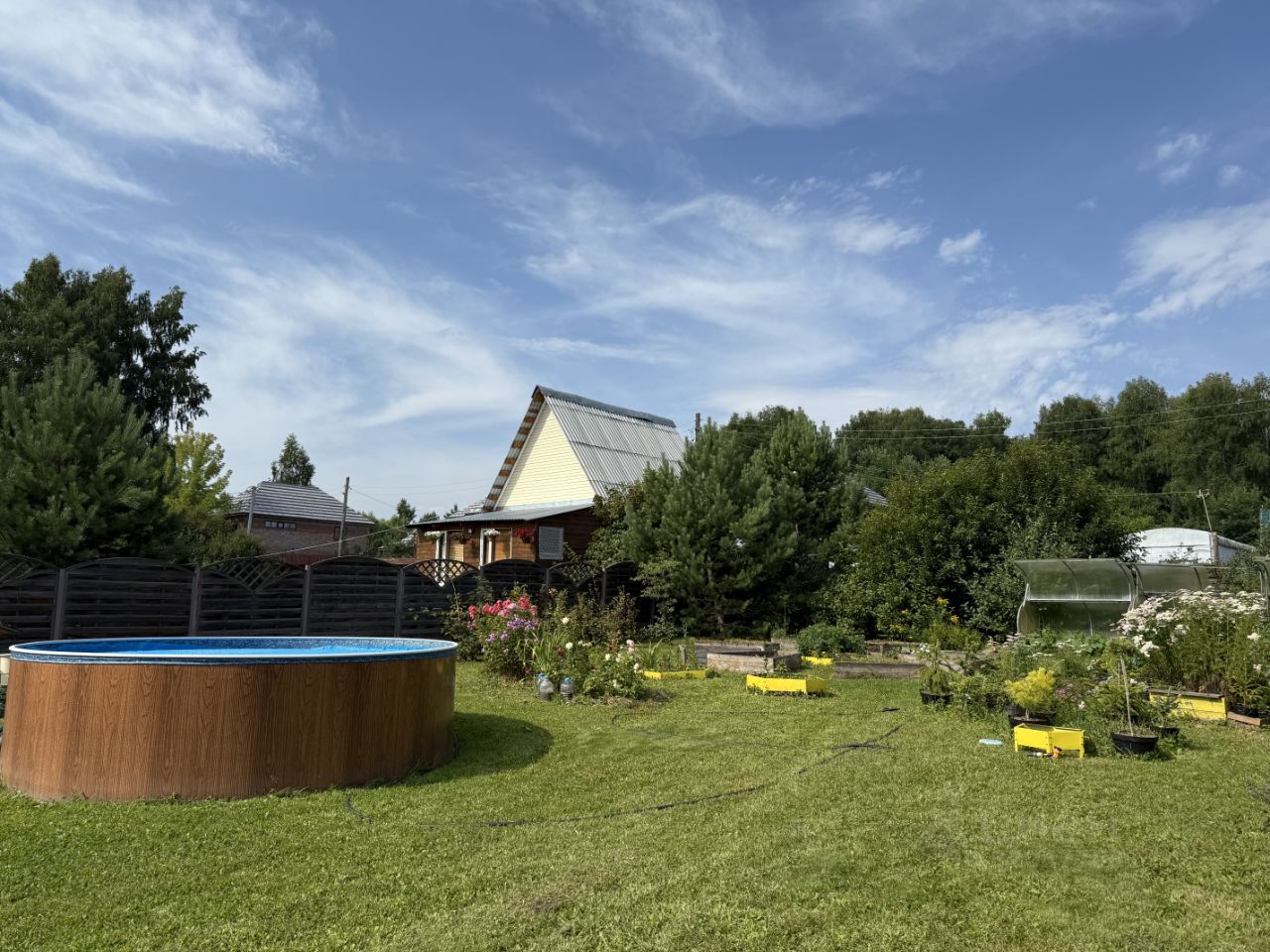 Продам дачу в перспективном, живописном месте. Дача расположена в СНТ Топограф, с. Плотниково, Новосибирский район, Новосибирская область. Общество окружено лесом. На участке имеется дом-баня с мансардным этажом, летним водопроводом и горячей водой, хоз. блок с летней кухней, теплица 3*6 м2, бассейн Azuro диаметром 3,6 м - каркасный, морозостойкий с песочным фильтром (демонтировать на зиму не нужно), батут, качеля, грядки высокие, парковочное место на 2 авто отсыпано щебнем. Посадки: яблони, черноплодная рябина, жимолость, ирга, вишня, смородина, малина, клубника, виноград, многолетние цветы.