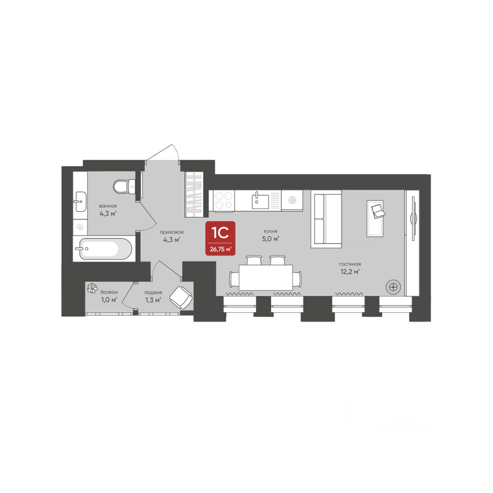 Общая площадь26,75 м2