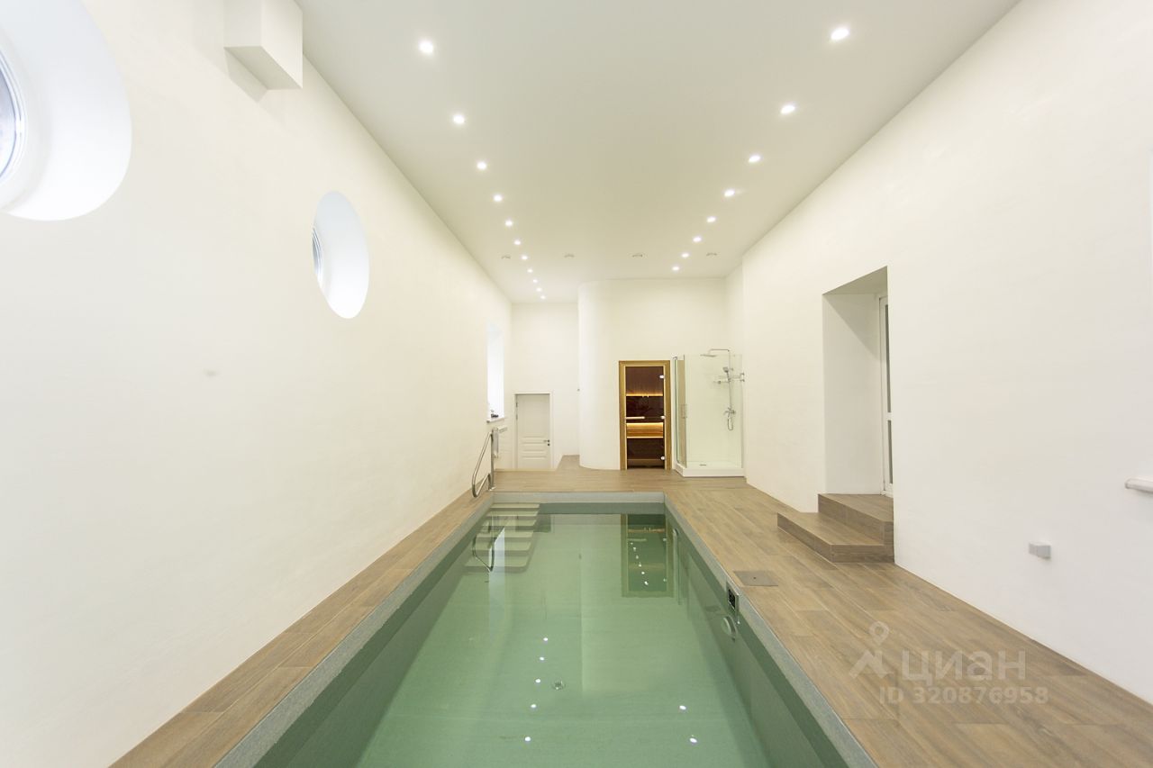 На первом этаже теплая веранда с подогревом пола, просторная прихожая с большой гардеробной, гостиная с действующим камином и вторым светом, высота потолка 7,5м., кухня-столовая (современный кухонный гарнитур со всей необходимой встраиваемой бытовой техникой), кабинет, сан узел. Так же на первом этаже располагается помещение с бассейном (его длинна 7,5м), Финская сауна из алтайского кедра (очень редкий и дорогой материал), душ.