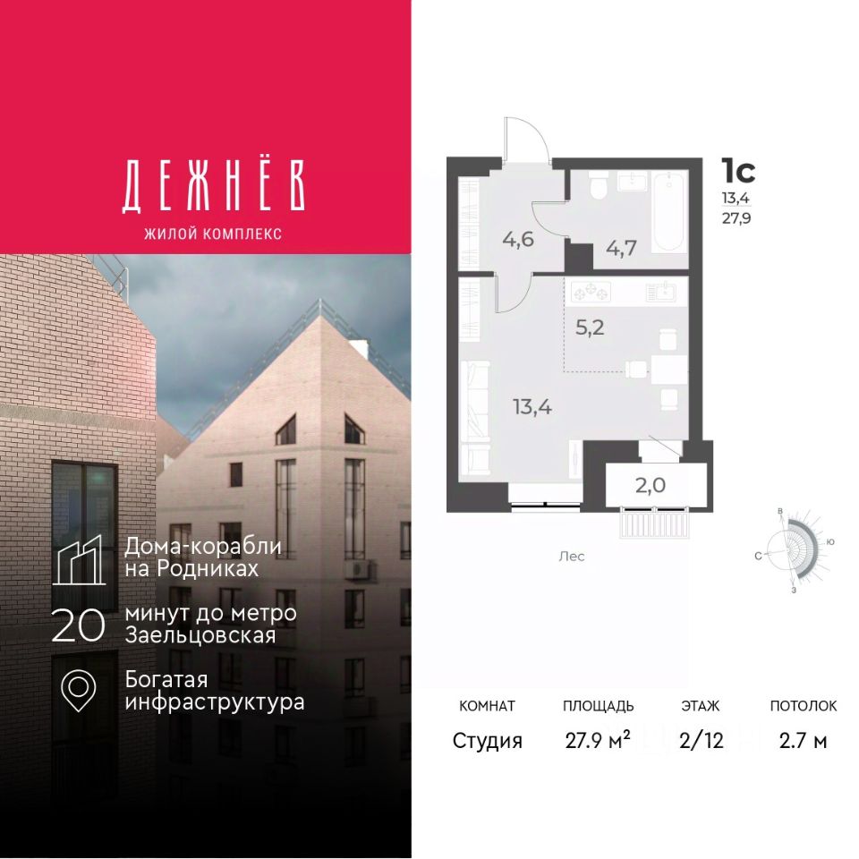 Продается однокомнатная квартира-студия с предчистовой отделкой в ЖК ''Дежнёв'' на 2 этаже. Общая площадь: 27.9 кв.м., площадь гостиной 18.6 кв.м., из которых 5.2 кв.м. выделено под кухонную зону. Все окна выходят на одну сторону. В квартире одна лоджия, один совмещенный санузел. Высота потолков 2.7 м.