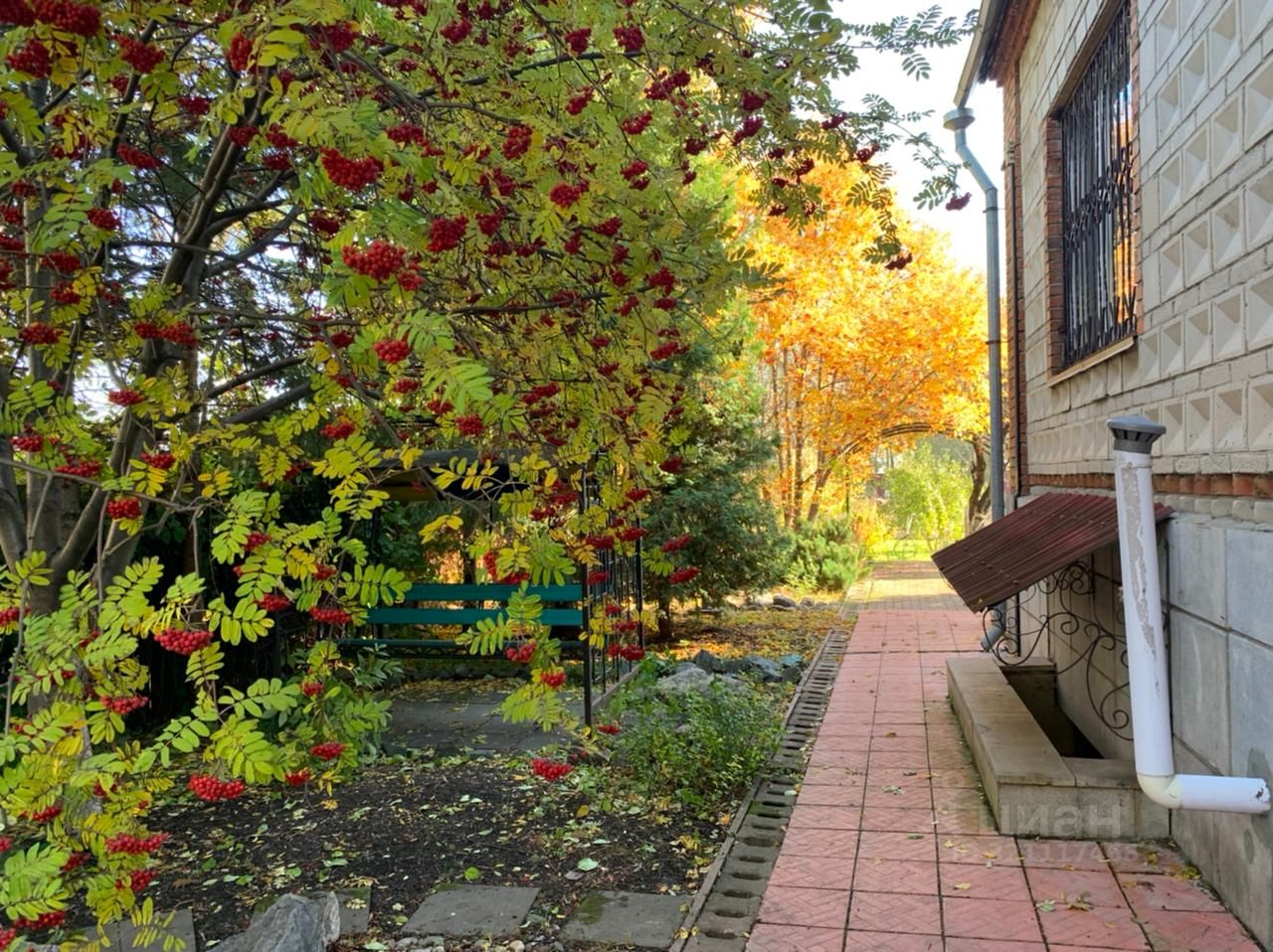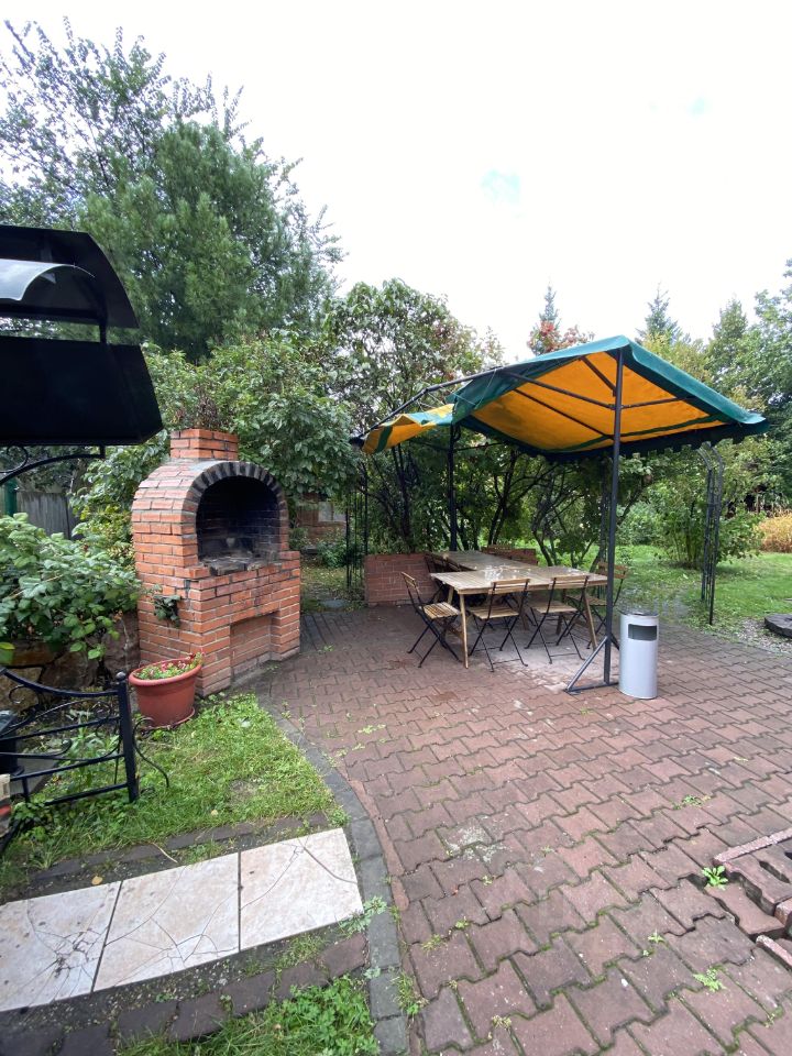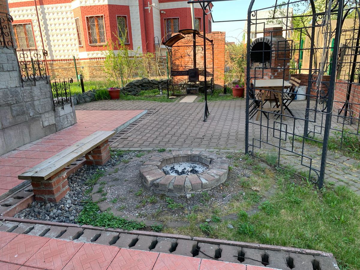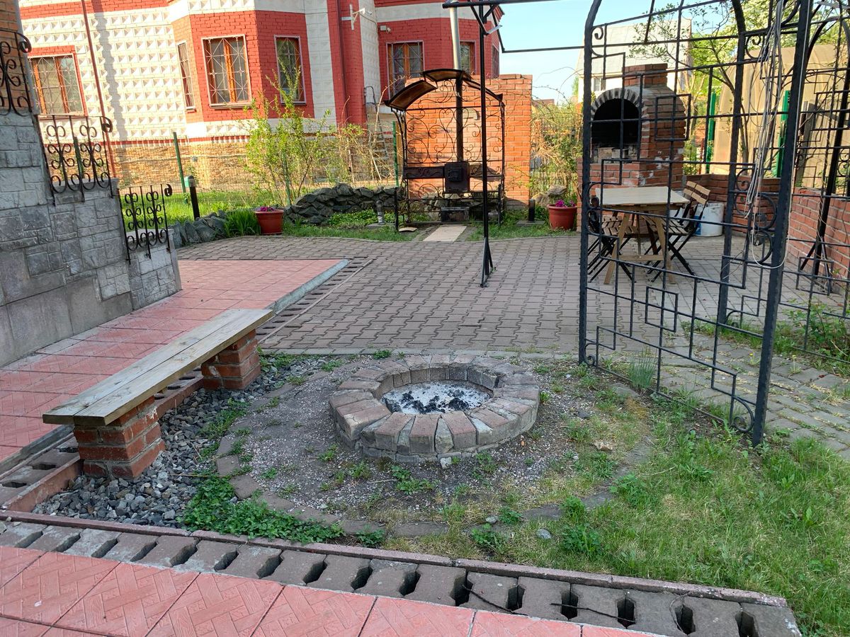 На участке высажены многолетние растения и разнообразные деревья, обустроена зона для барбекю-мангал, тандыр, зона отдыха, пруд.