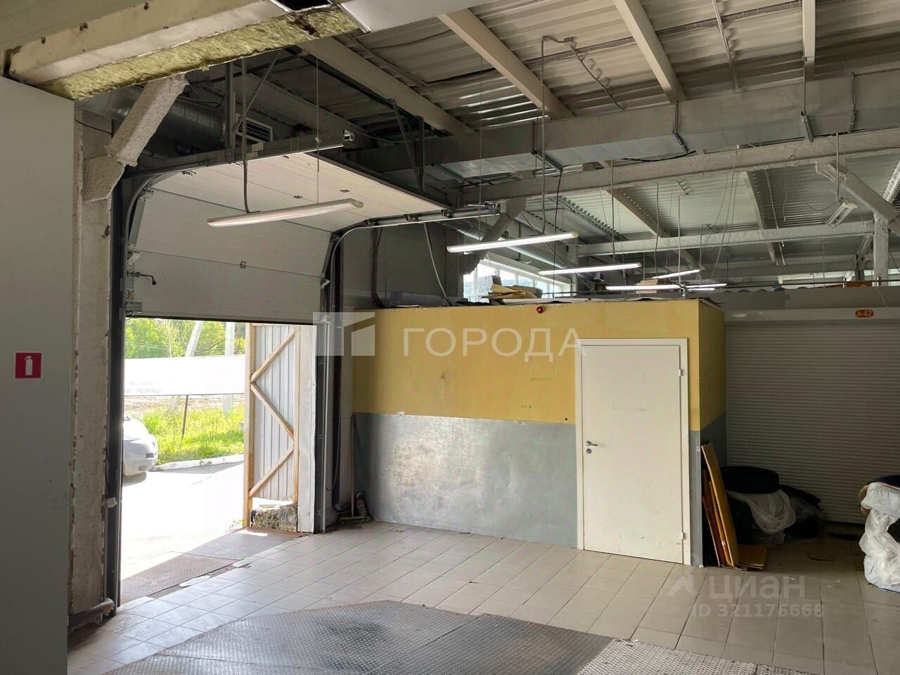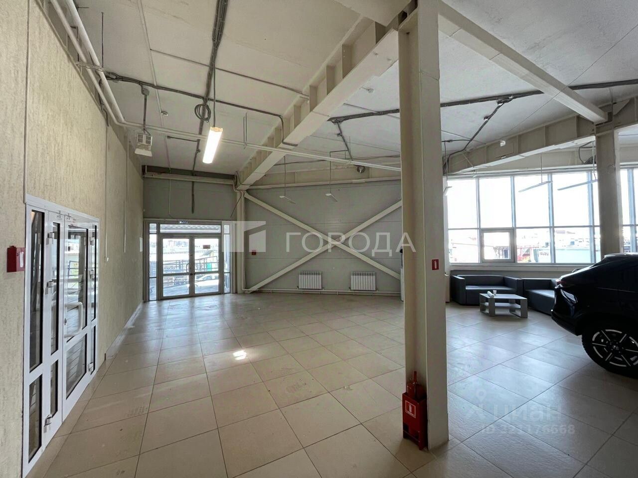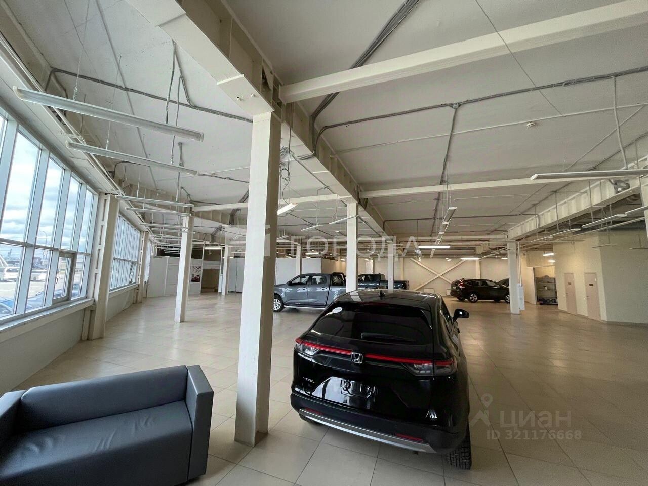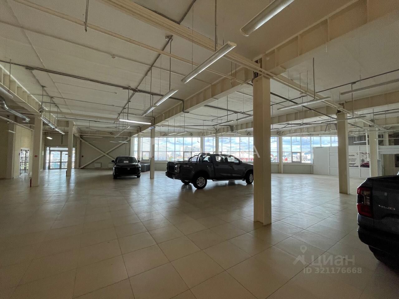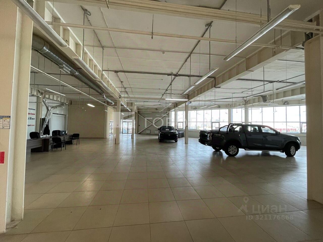 В помещении есть светлые панорамные окна ,высокие потолки ,ворота для загрузки.
