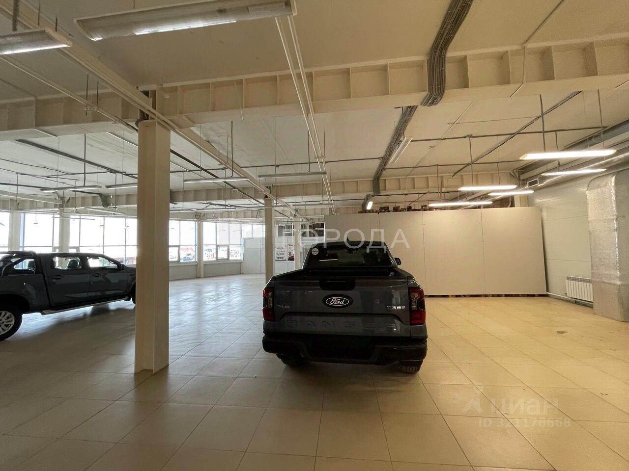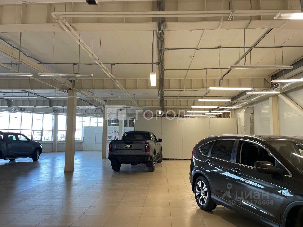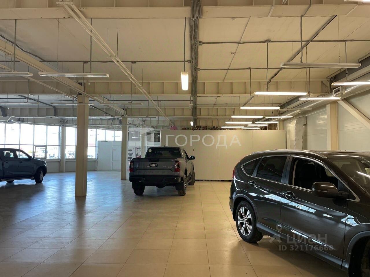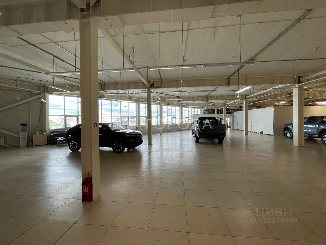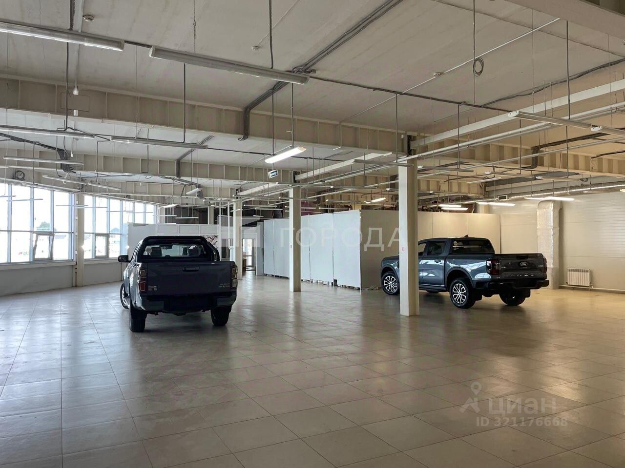 В помещении есть светлые панорамные окна ,высокие потолки ,ворота для загрузки.