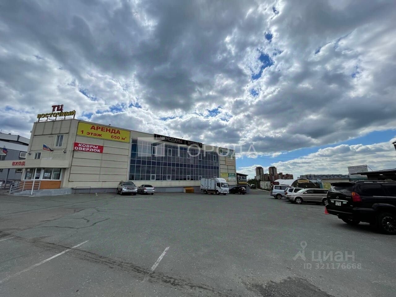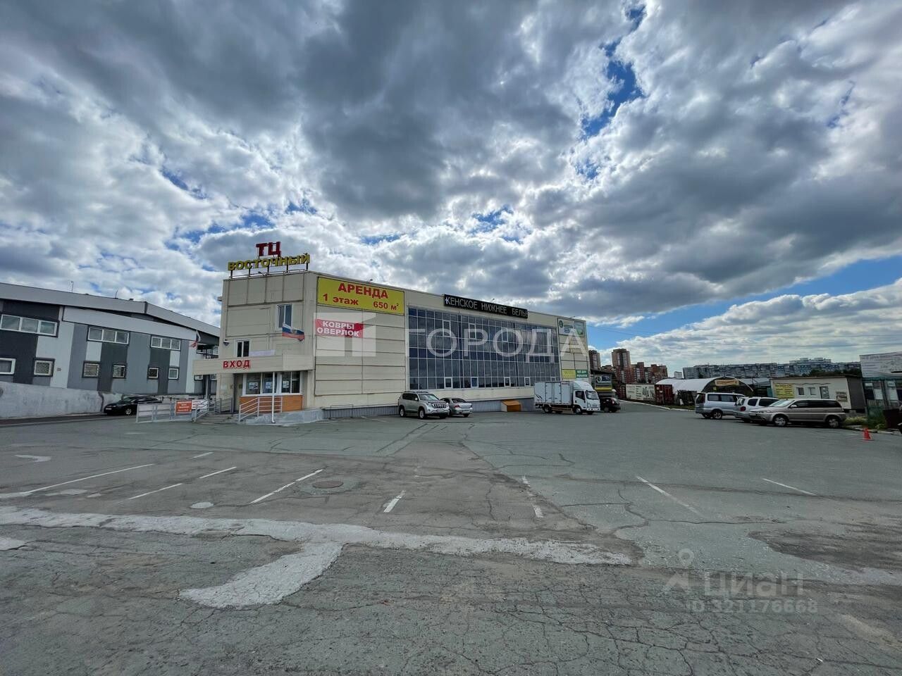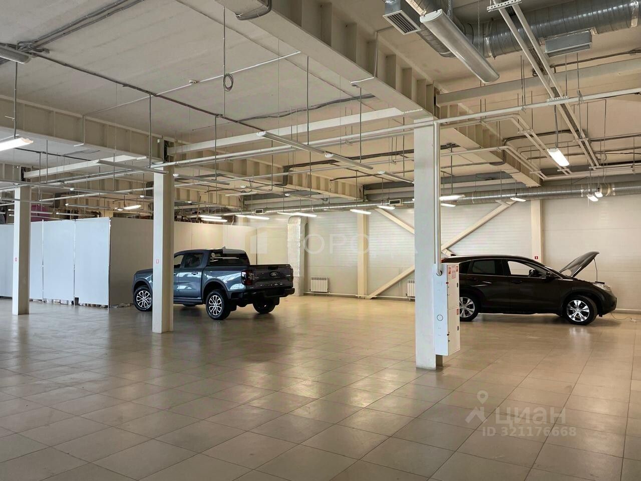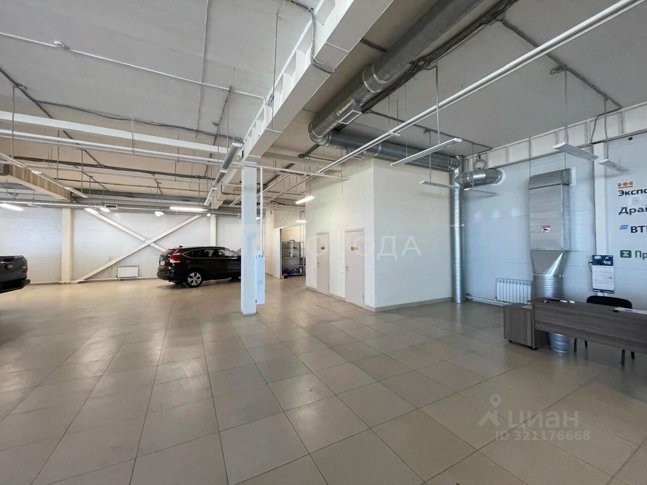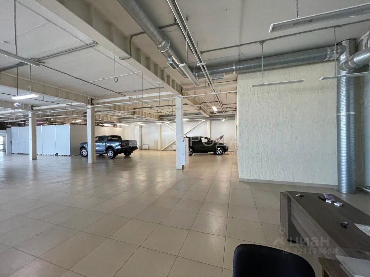 В помещении есть светлые панорамные окна ,высокие потолки ,ворота для загрузки.