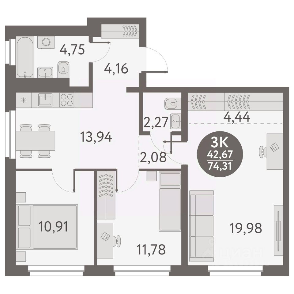 Общая площадь74,31 м2