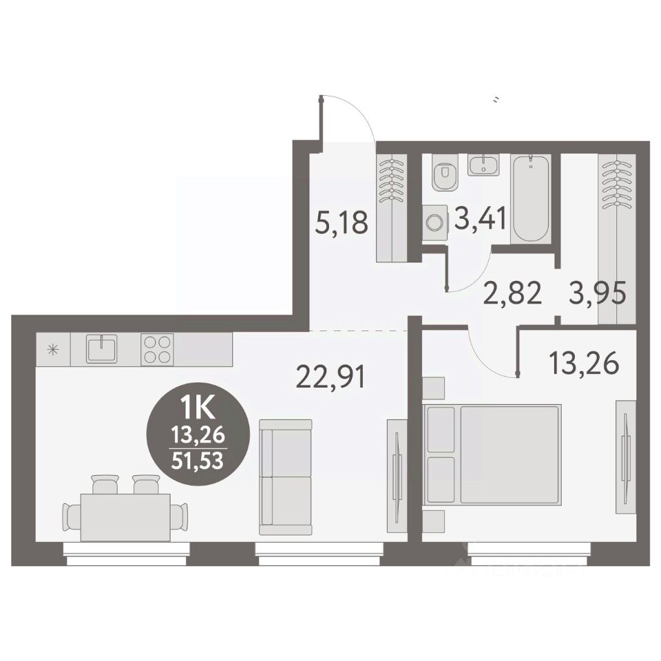 Общая площадь51,53 м2