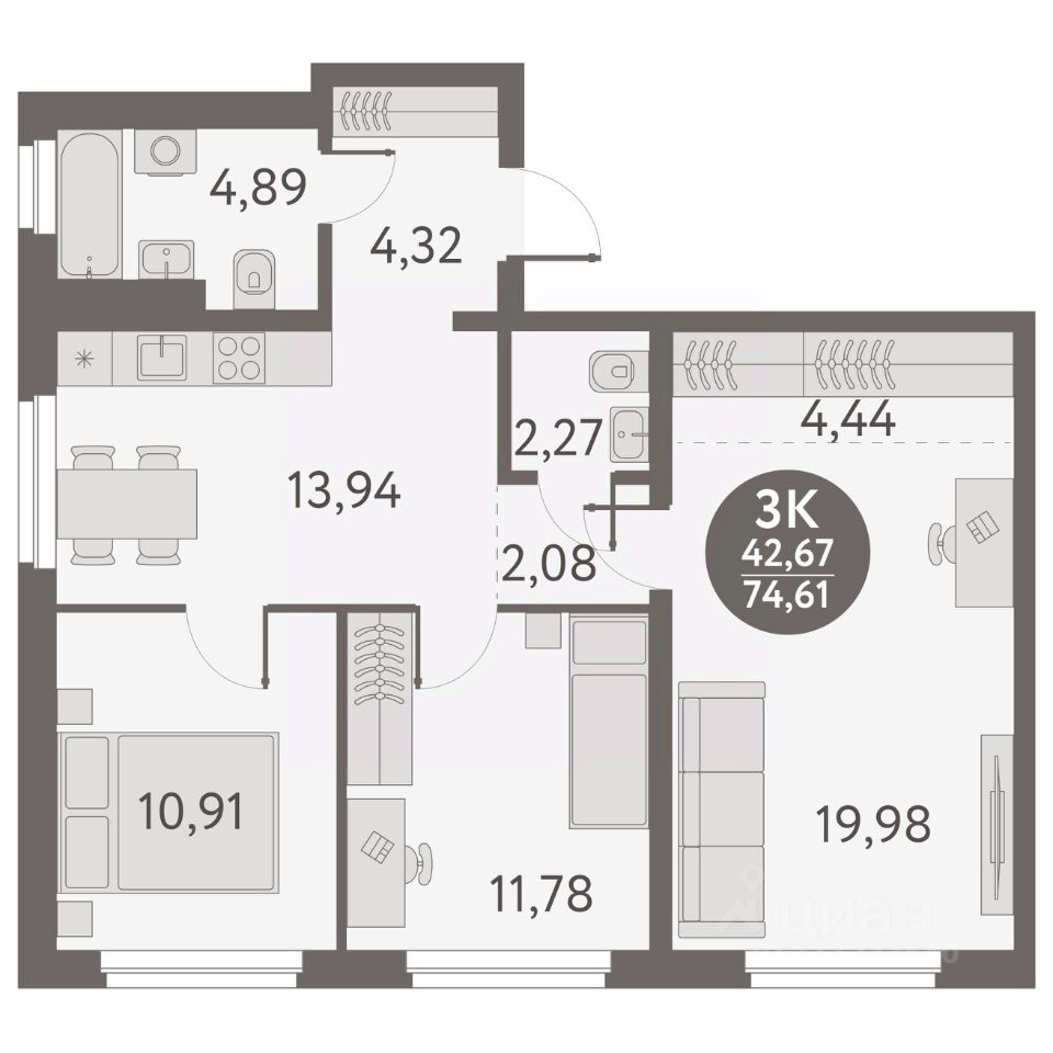 Общая площадь74,61 м2