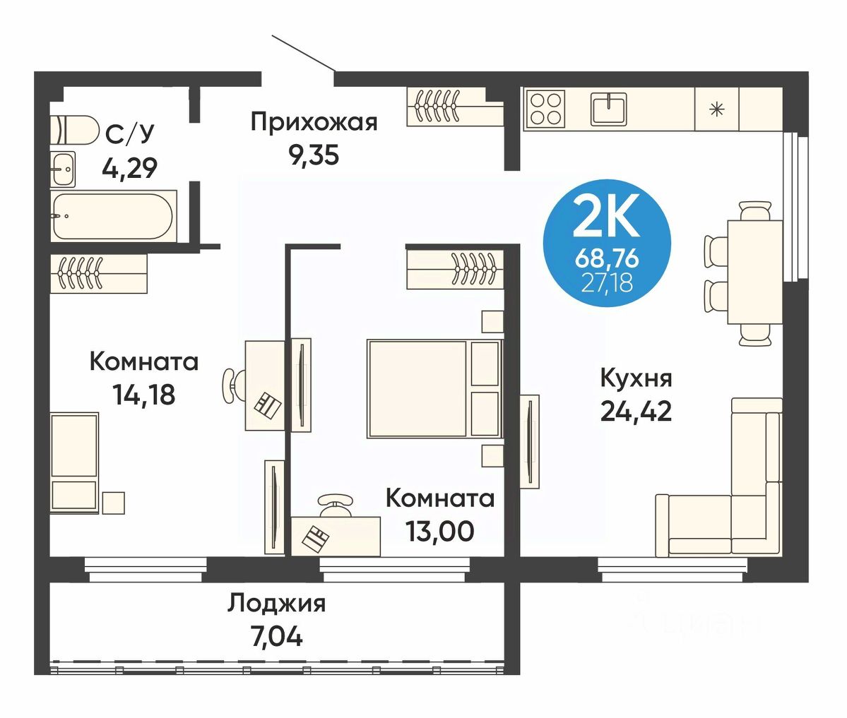 Общая площадь68,76 м2