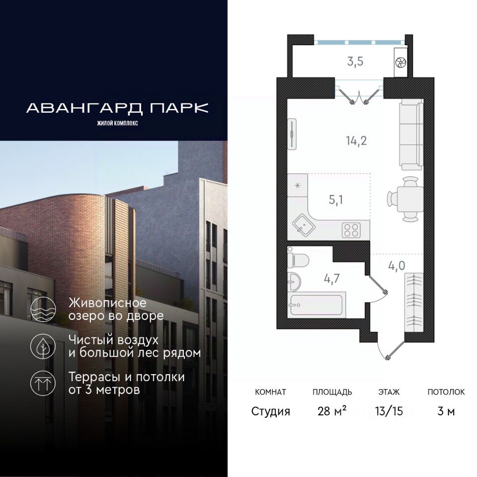 1-комн. квартира-студия от застройщика с предчистовой отделкой в ЖК ''Авангард Парк'' на 13 этаже. Общая площадь: 28 кв.м., площадь гостиной 19.3 кв.м., из которых 5.1 кв.м. выделено под кухонную зону. Все окна выходят на одну сторону. В квартире один балкон, один совмещенный санузел. Высота потолков 3 м.