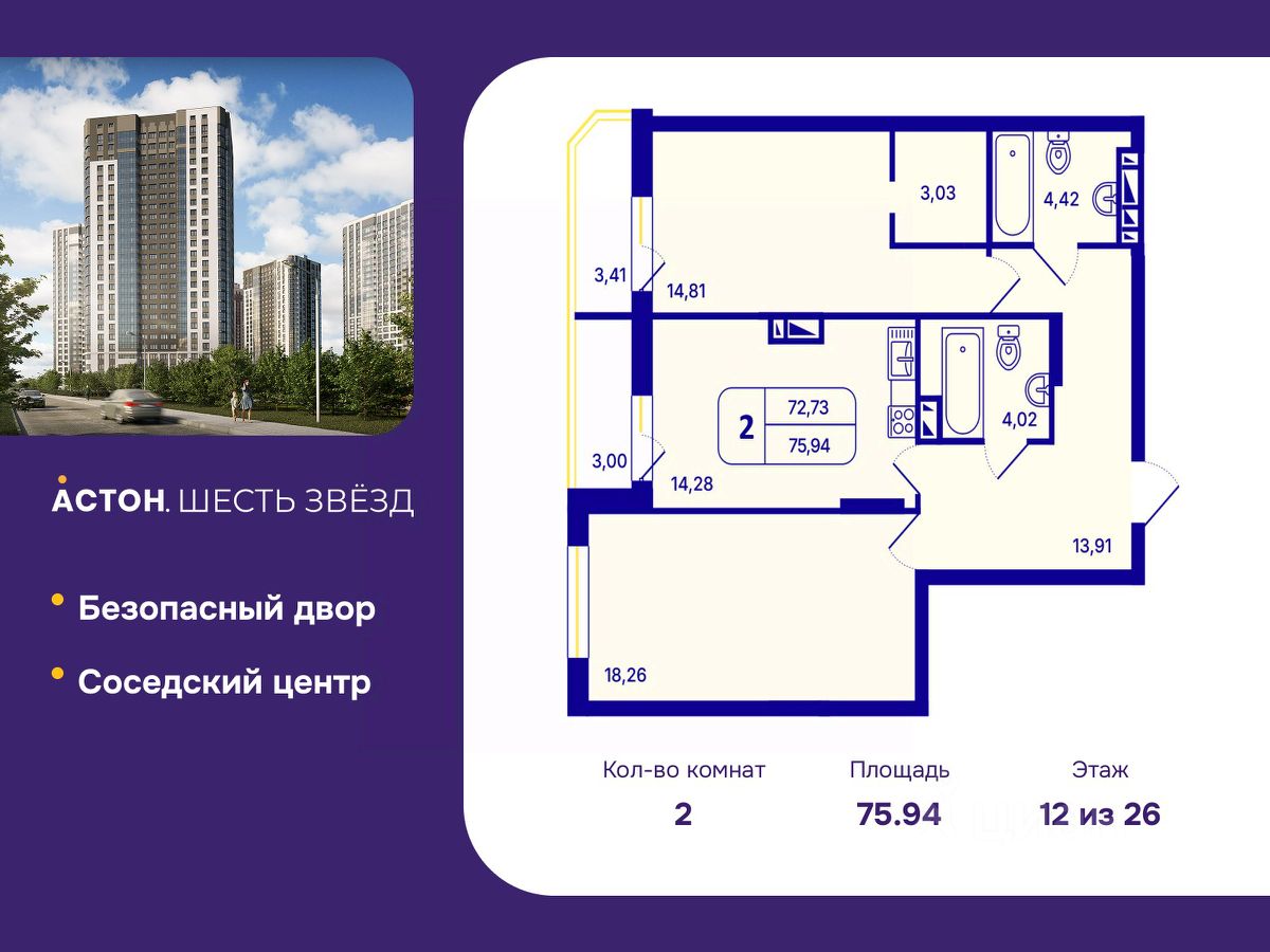Двухкомнатная квартира от застройщика с предчистовой отделкой в ЖК ''Астон. Шесть Звезд'' на 12 этаже. Общая площадь: 75.94 кв.м., жилая: 33.07 кв.м., площадь просторной кухни-столовой: 14.28 кв.м. Комнаты изолированные, все окна выходят на одну сторону. В квартире две лоджии, два совмещенных санузла. Высота потолков 2.65 м.
