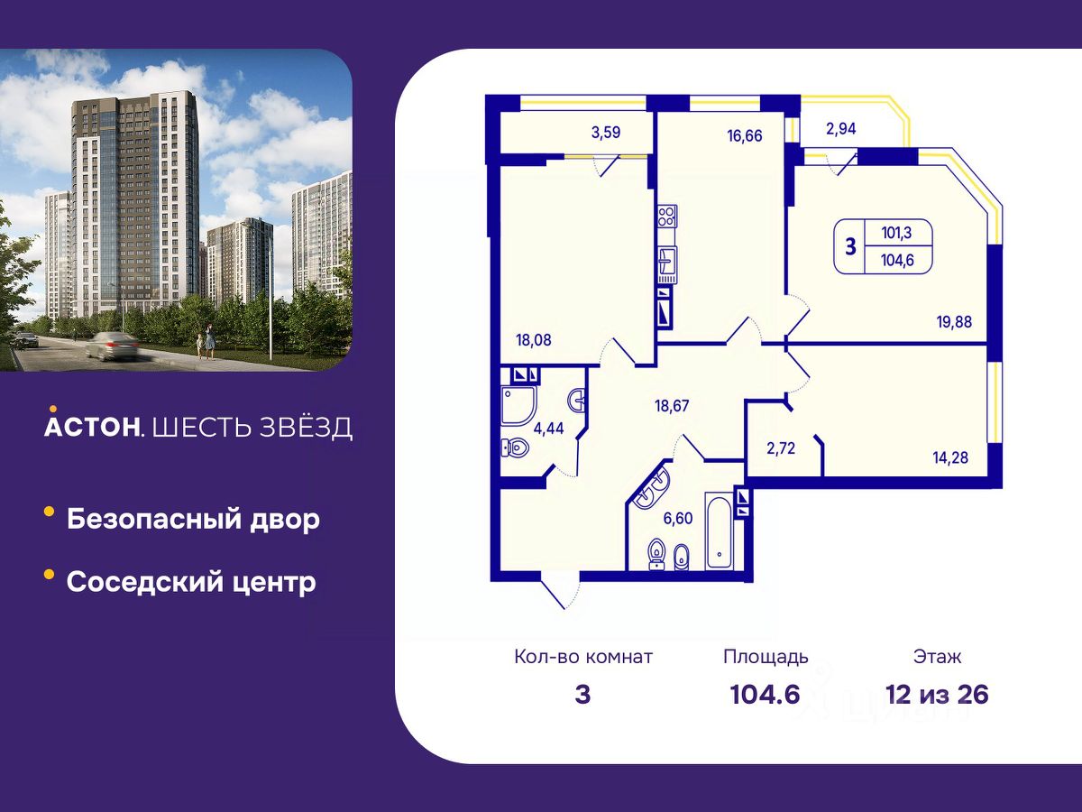 Просторная 3-комн. квартира с предчистовой отделкой в ЖК ''Астон. Шесть Звезд'' на 12 этаже. Общая площадь: 104.6 кв.м., жилая: 52.24 кв.м., площадь просторной кухни-столовой: 16.66 кв.м. Угловая квартира, идеально подойдет любителям тишины и панорамных видов. В квартире две лоджии, два совмещенных санузла. Высота потолков 2.65 м.