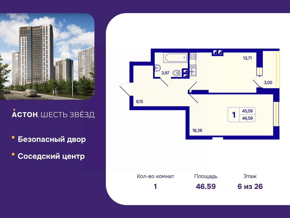 Однокомнатная квартира с предчистовой отделкой в ЖК ''Астон. Шесть Звезд'' на 6 этаже. Общая площадь: 46.59 кв.м., жилая: 18.226 кв.м., площадь просторной кухни-столовой: 13.71 кв.м. Все окна выходят на одну сторону. В квартире одна лоджия, один совмещенный санузел. Высота потолков 2.65 м.