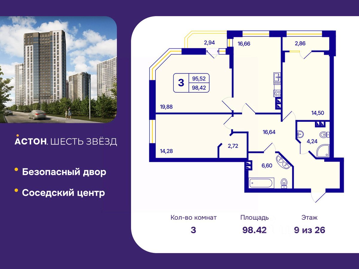 3-комн. квартира с предчистовой отделкой в ЖК ''Астон. Шесть Звезд'' на 9 этаже. Общая площадь: 98.42 кв.м., жилая: 48.66 кв.м., площадь просторной кухни-столовой: 16.66 кв.м. Угловая квартира, очень светлая, естественная вентиляция при открытии окон. В квартире одна лоджия, два совмещенных санузла. Высота потолков 2.65 м.