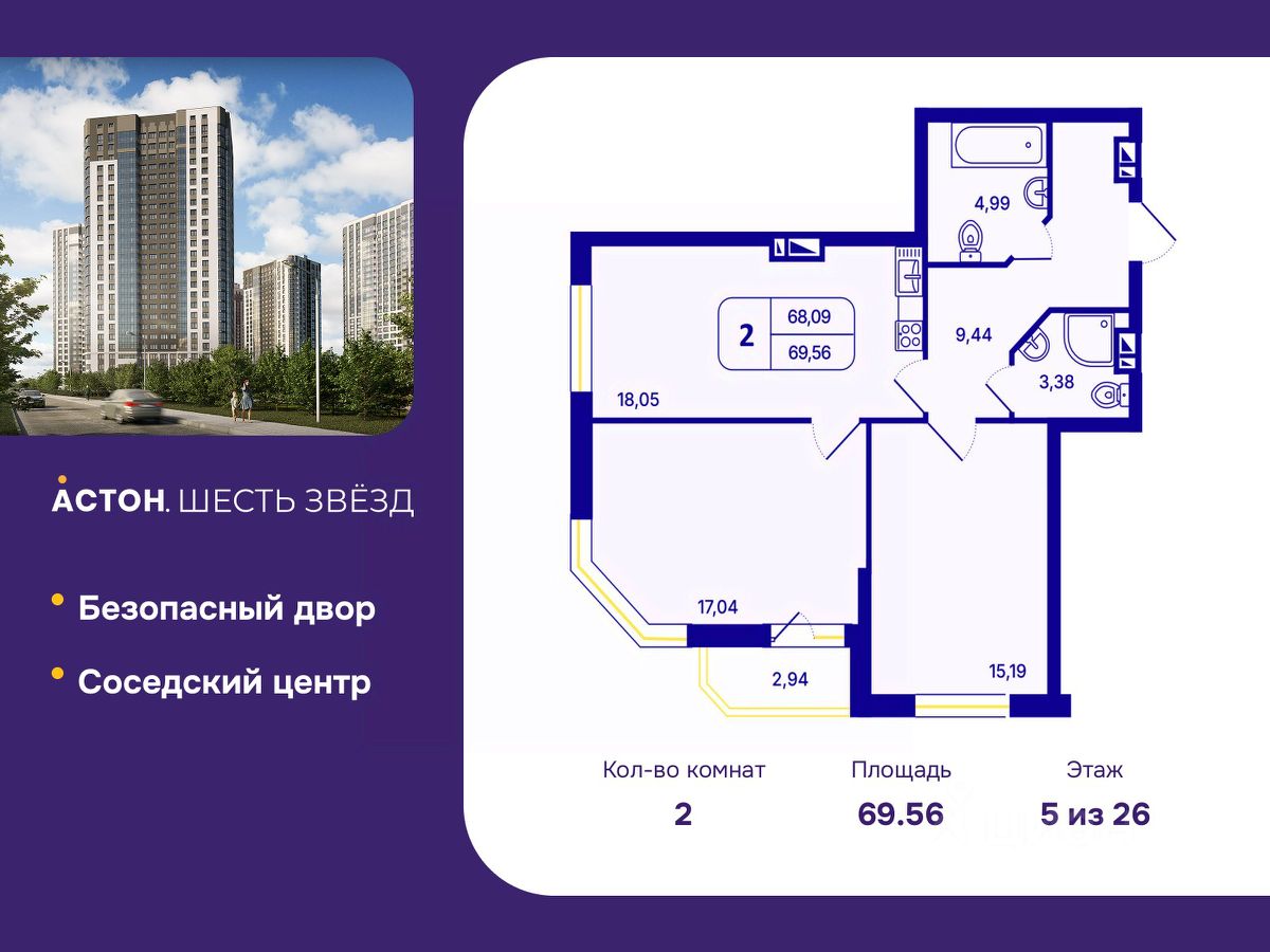 Продается 2-комн. квартира с предчистовой отделкой в ЖК ''Астон. Шесть Звезд'' на 5 этаже. Общая площадь: 69.56 кв.м., жилая: 32.23 кв.м., площадь просторной кухни-столовой: 18.05 кв.м. Угловая квартира, очень светлая, естественная вентиляция при открытии окон. В квартире одна лоджия, два совмещенных санузла. Высота потолков 2.65 м.