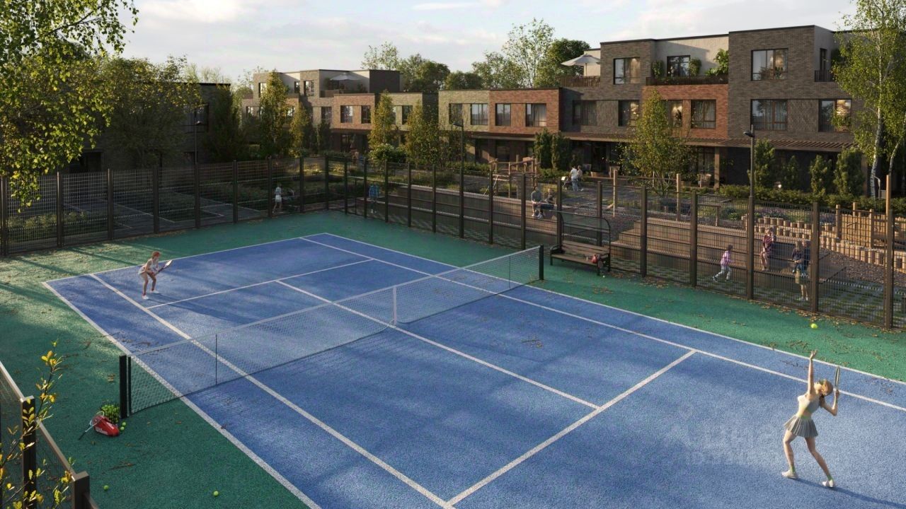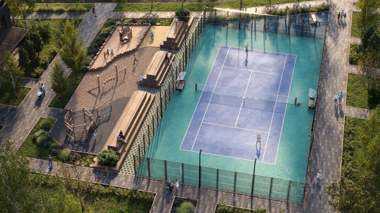 Территория закрыта от машин, есть детские и спортивные площадки, скейт-парк и теннисный корт.