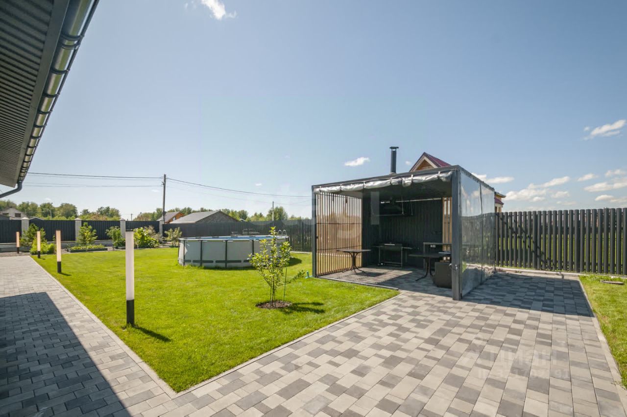 Кухня оборудована встроенной техникой (духовка, микроволновая печь, варочная поверхность, вытяжка, посудомоечная машина) и мебелью из МДФ с фурнитурой Blum. Санузел оснащен сантехникой AM.PM, смесителями и душем GAPPO. На участке есть крытая веранда с террасной доской и ПВХ-шторами, зона барбекю с мангалом, вытяжкой принудительной конвекции и столами из нержавеющей стали, а также бассейн диаметром 4,5 м с системой фильтрации и подогрева воды.