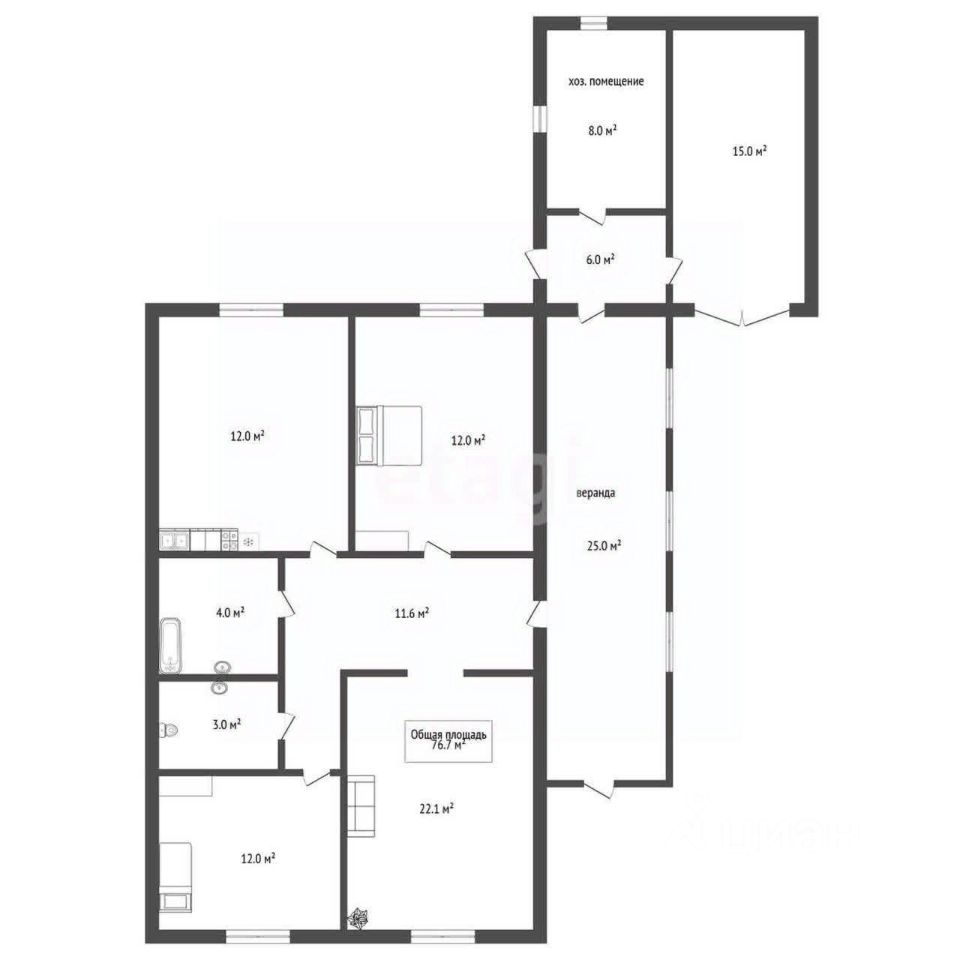 Общая площадь 76,7 кв.м жилая 46,1.-кухня 12, гостиная 22,1кв.м, 2 спальни по 12 кв.м, Летняя веранда 25 кв.м,в доме есть небольшой погреб и погреб во дворе.