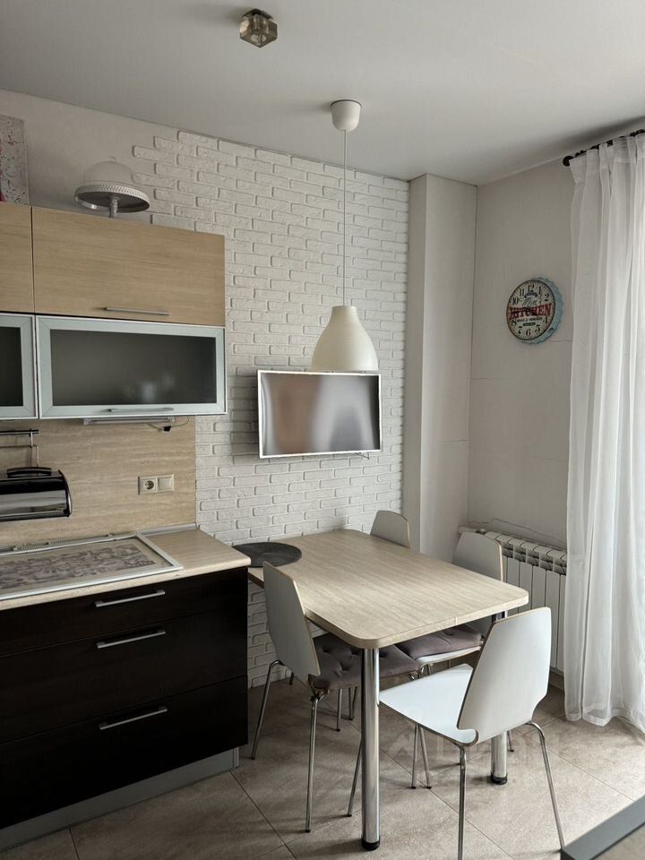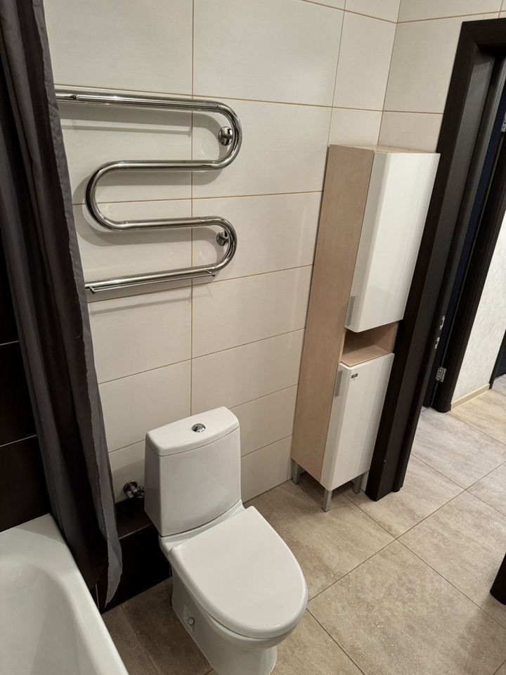 Большая однокомнатная квартира с дизайнерским ремонтом (2012 год), 5 лет назад делали косметический ремонт. В комнате зонирование на 2 зоны (детская + спальня), на кухне есть диван и телевизор, что позволяет ее использовать как гостиную. В коридоре небольшая, но очень функциональная гардеробная. С/у совмещенный, около 5 кв. Метров. Сантехника и все смесители импортные. Есть водонагреватель. Балкон утепленный, использовался как дополнительное место для хранения гладильной доски и других бытовых нужд. На кухне есть вся бытовая техника + частично посуда. Новая стиральная машинка в ванной комнате. Постельное белье и полотенца. В коридоре, на кухне и в с/у на полу керамогранит, в комнате ламинат.