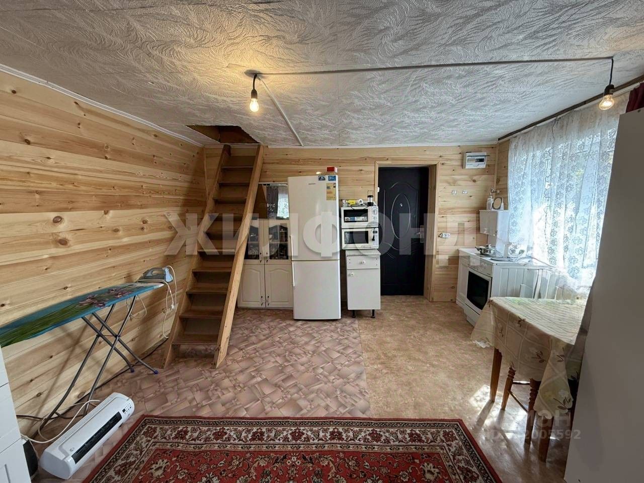Пол и стены утеплены пеноплексом и обшиты деревянной вагонкой. Под тратуарной плиткой проложена гидроизоляция (предотвращение попадания влаги). Вода и электричество подключены к дому. На 1-м этаже большая комната и кухонная зона. Имеется электрическая плита, холодильник, кровать, микроволновая печь, кресло, комод, стол, стулья, шкаф остается новым владельцам). На 2-й этаж ведет деревянная лестница, который разделен на 3 помещения, но использовался как чердак. С легкостью можно обустроить доп. место для отдыха.