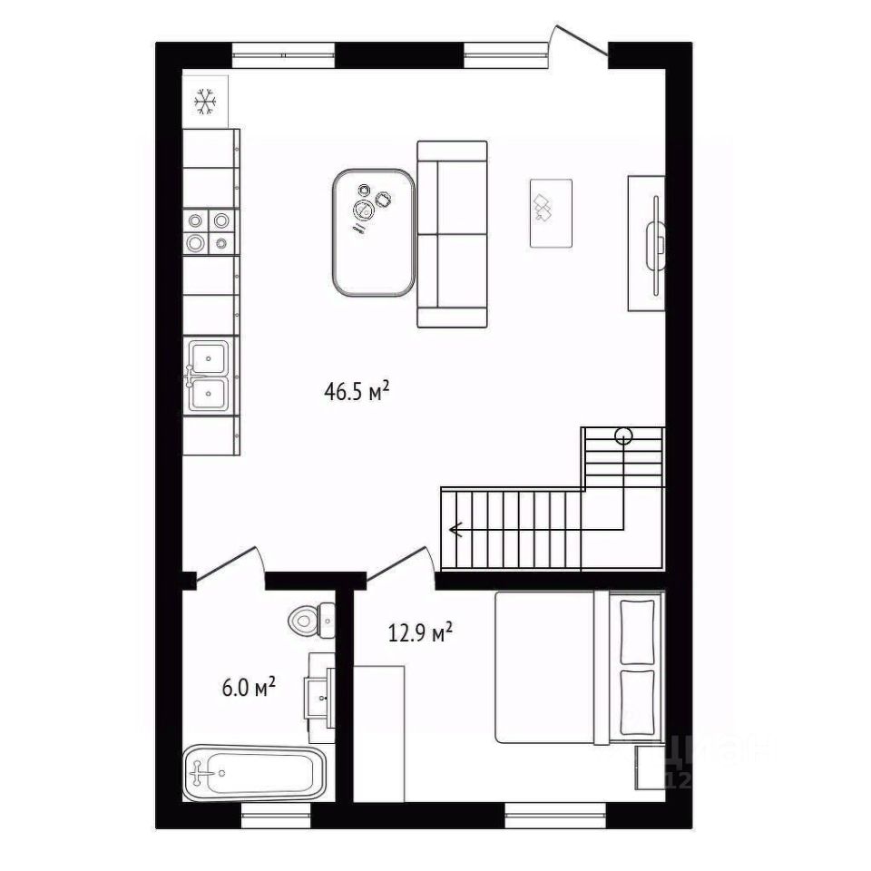 Просторная прихожая с большим гардеробным шкафом. Гостиная-столовая, совмещённая с современной кухней и выходом на остеклённый балкон. Выход в сад и к зоне отдыха. Прачечная (остаётся стиральная машина) и гостевой туалет. Техника на кухне, которая остаётся: холодильник, индукционная плита, духовой шкаф, посудомоечная машина.