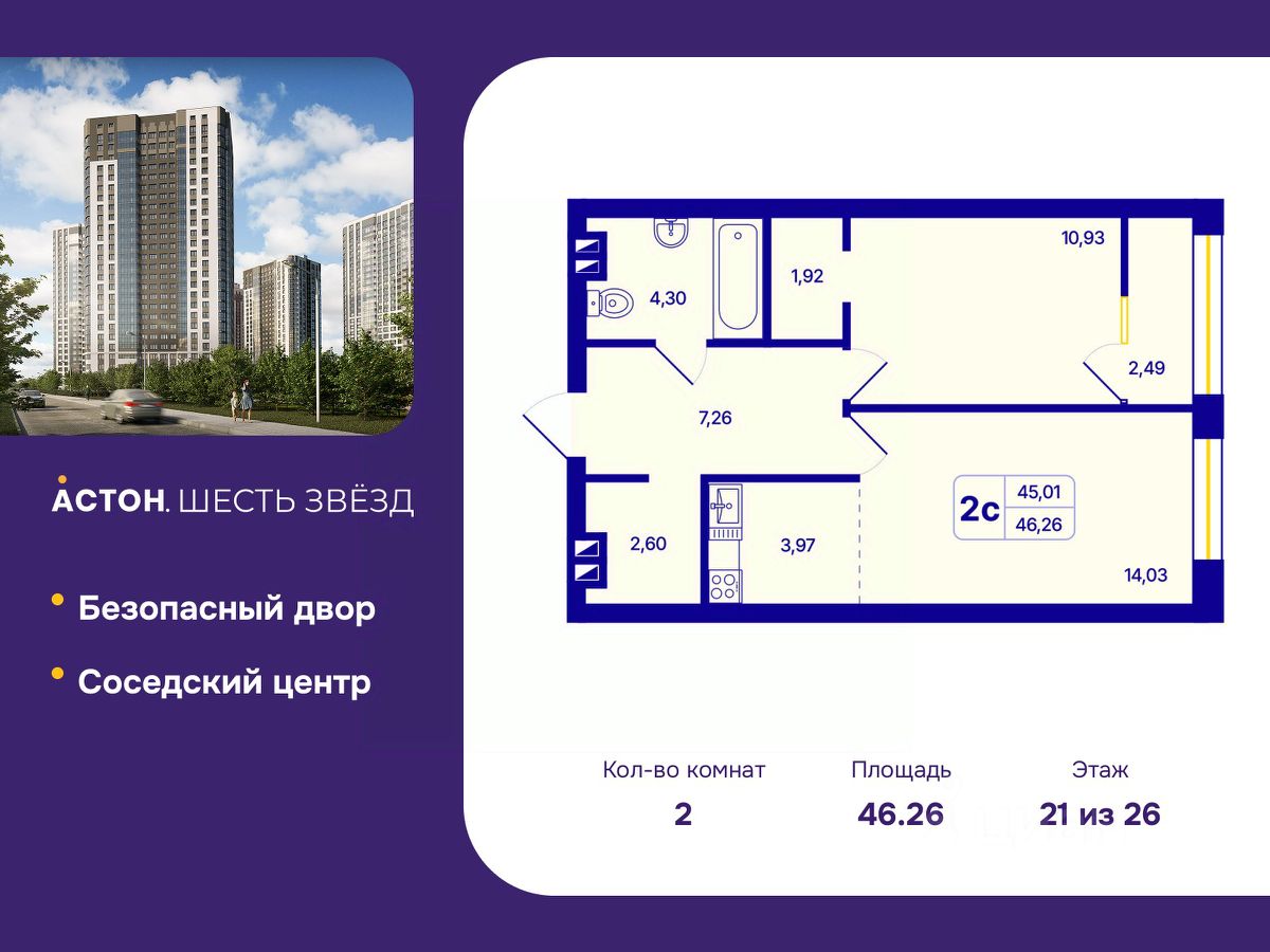 Просторная 2-комн. квартира с европланировкой и предчистовой отделкой в ЖК ''Астон. Шесть Звезд'' на 21 этаже. Общая площадь: 46.26 кв.м., жилая: 24.96 кв.м., суммарная площадь гостиной-столовой с кухонной зоной: 18.0 кв.м. Европланировка, в просторной кухне-гостиной удобно как готовить, так и отдыхать. Комнаты изолированные, все окна выходят на одну сторону. В квартире одна лоджия, один совмещенный санузел. Высота потолков 2.65 м.