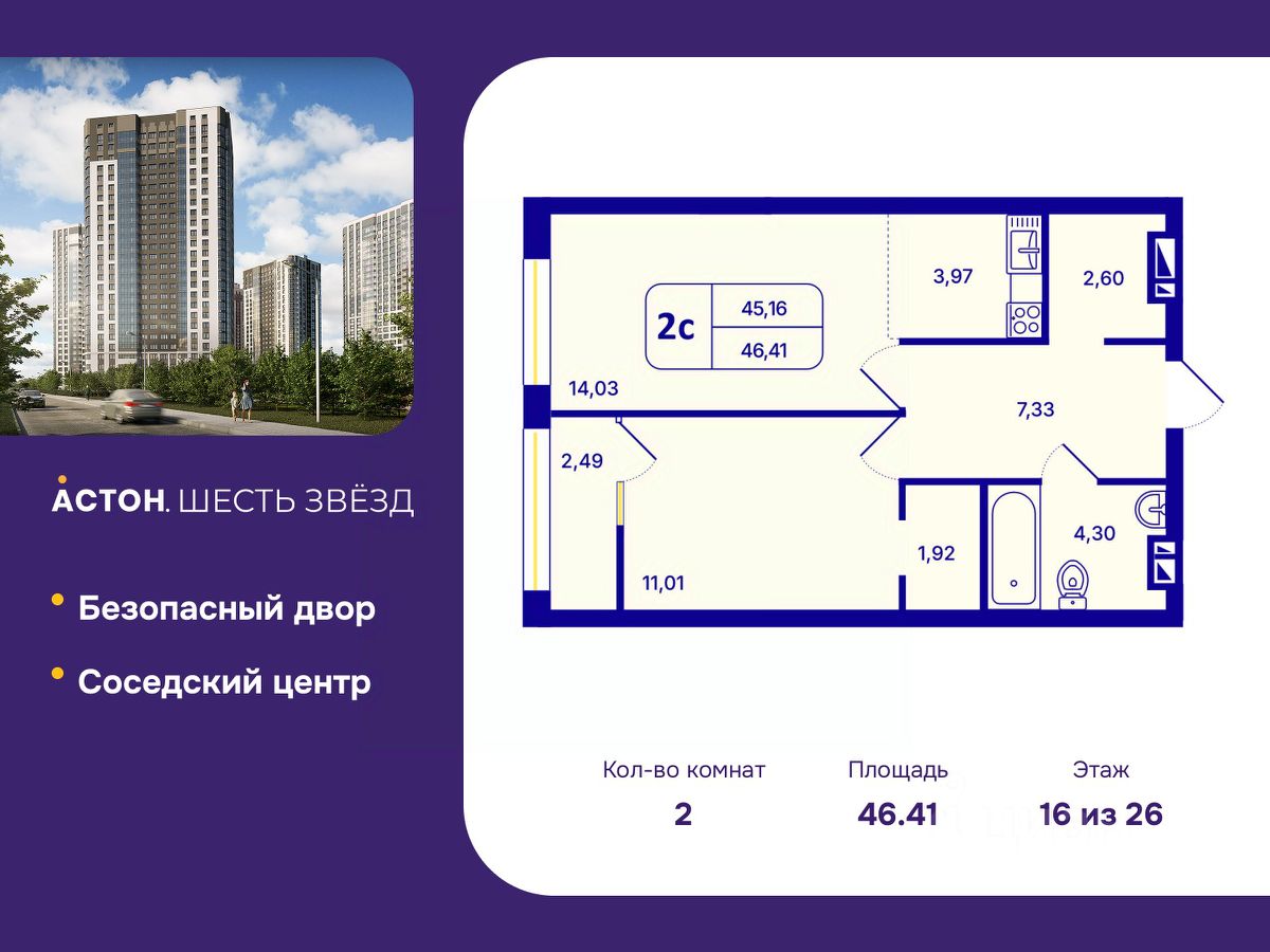 Продается двухкомнатная квартира с европланировкой и предчистовой отделкой в ЖК ''Астон. Шесть Звезд'' на 16 этаже. Общая площадь: 46.41 кв.м., жилая: 25.04 кв.м., общая площадь гостиной-столовой с кухонной зоной: 18.0 кв.м. Европланировка, кухня и гостиная объединены в одно просторное помещение. Комнаты изолированные, все окна выходят на одну сторону. В квартире одна лоджия, один совмещенный санузел. Высота потолков 2.65 м.